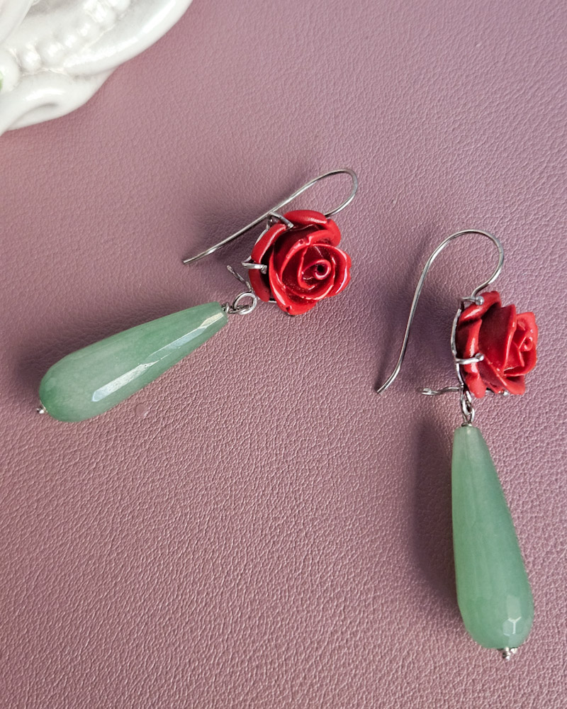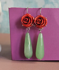 Orecchini Pendenti in Argento 925 con Rose in Resina e Agata Verde