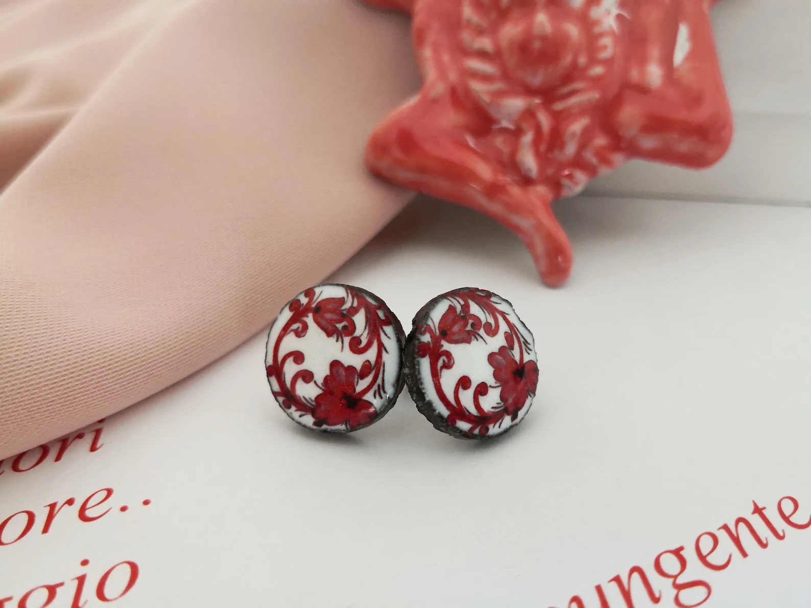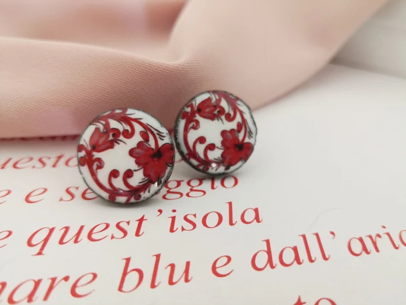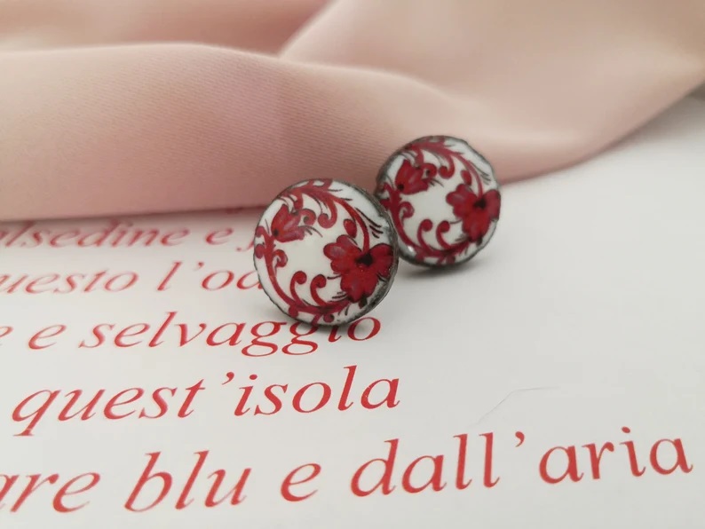 Deliziosi bottoni al lobo in pietra lavica e Ceramica di Caltagirone con fantasia floreale.