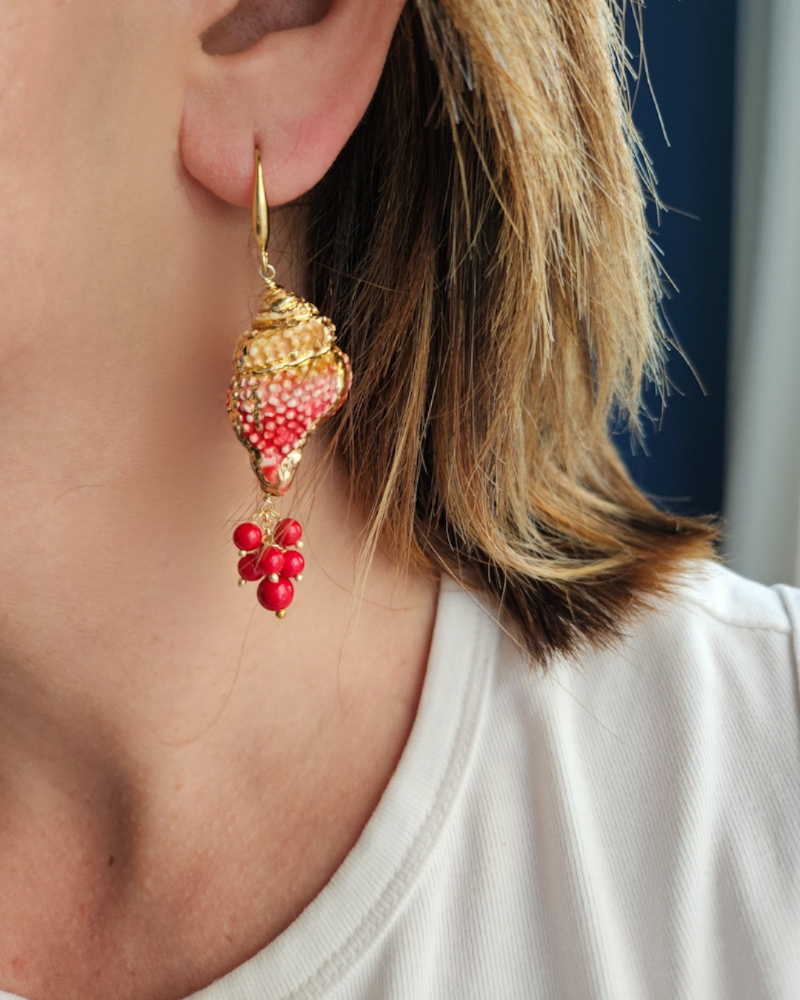 Orecchini Siciliani con Conchiglie in Ceramica di Caltagirone e Pietre Rosse