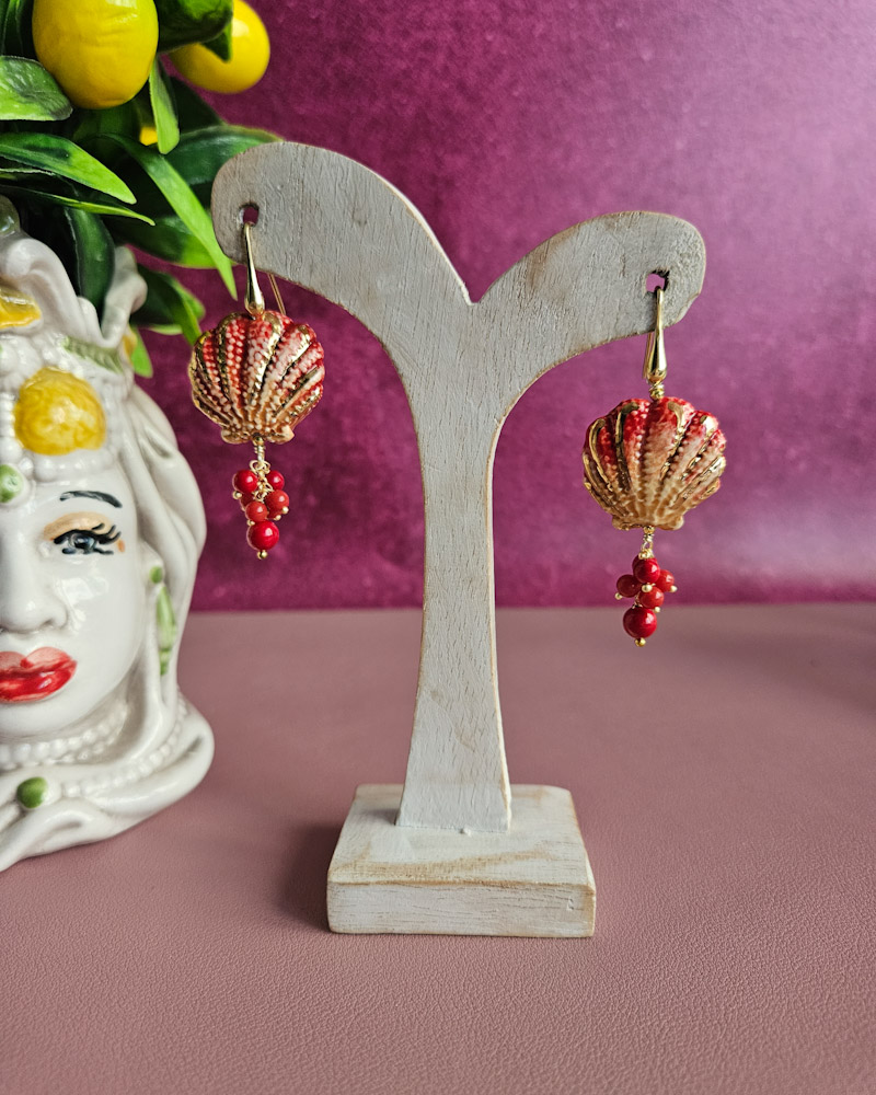 Orecchini Siciliani con Conchiglie in Ceramica di Caltagirone e Pietre Rosse