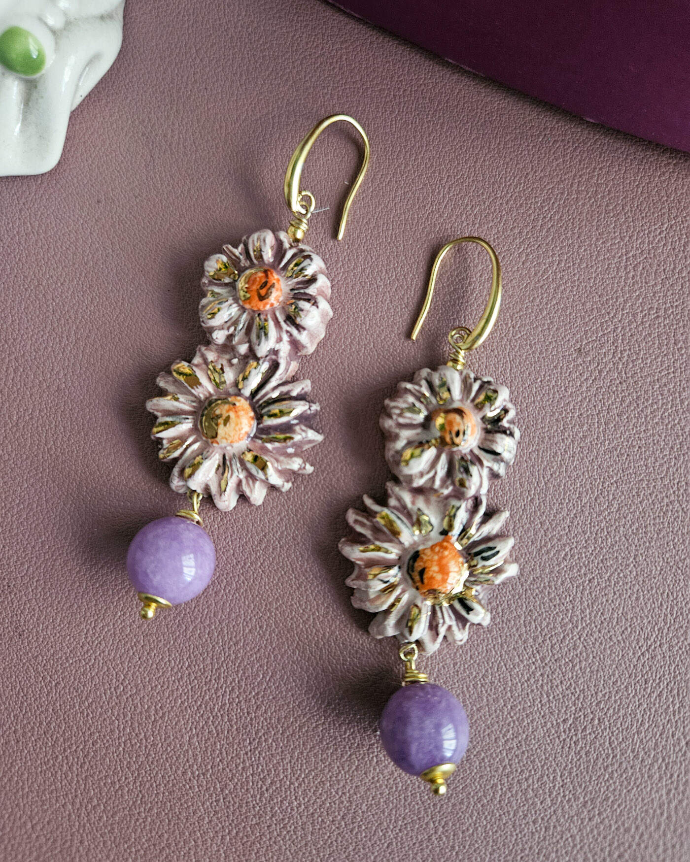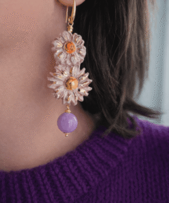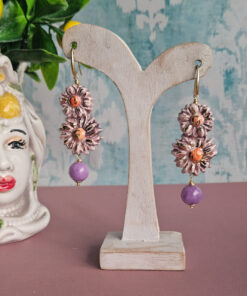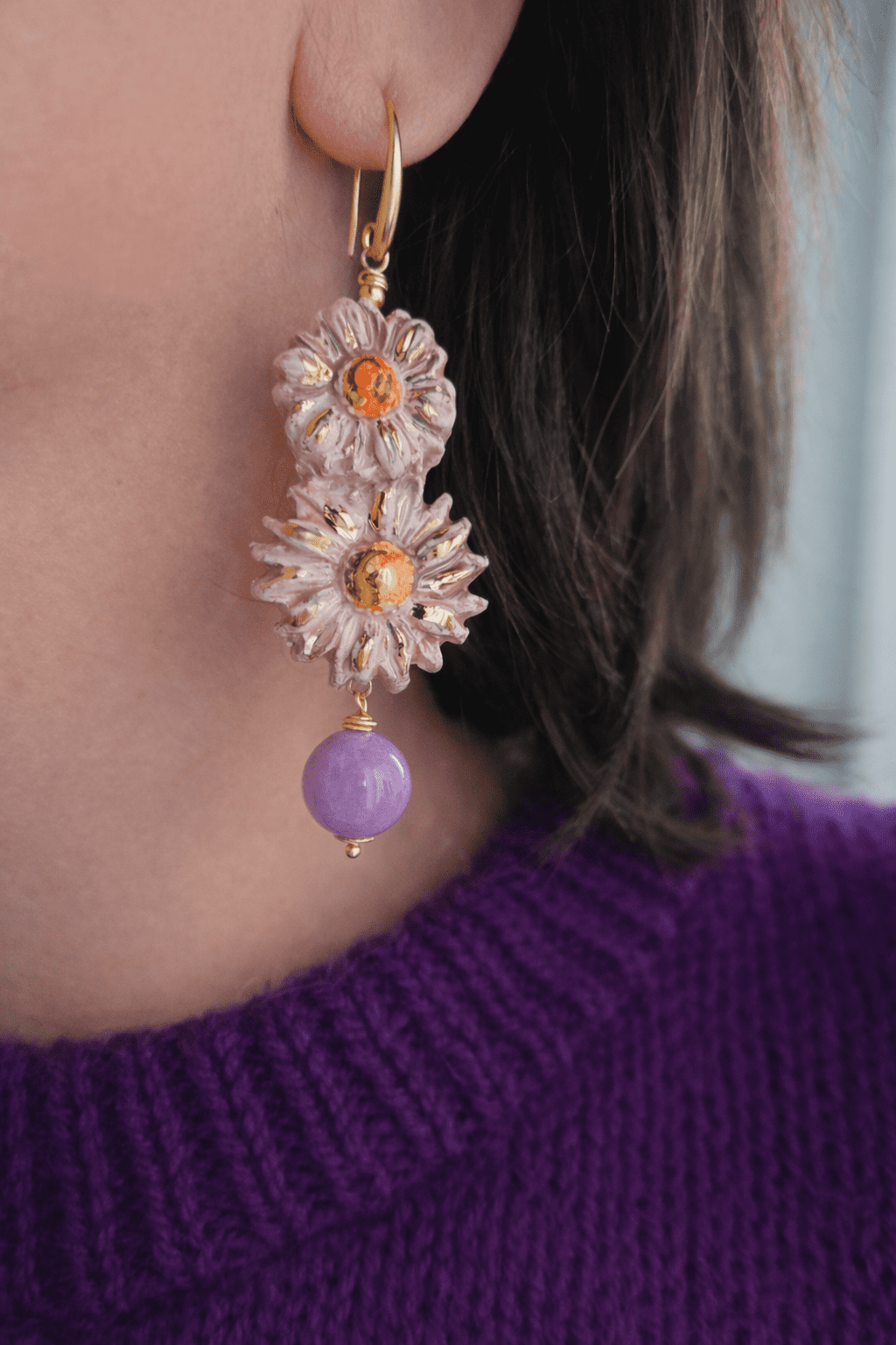 Questi orecchini sono composti da due fiori modellati e dipinti a mano, con petali tridimensionali leggermente irregolari che raccontano la cura e l’unicità della lavorazione artigianale. La ceramica, smaltata in delicate tonalità cipria e lilla, è impreziosita da raffinati tocchi dorati che catturano la luce e donano luminosità al design. Al centro di ciascun fiore, un nucleo arancio caldo crea un contrasto armonioso e vivace.
