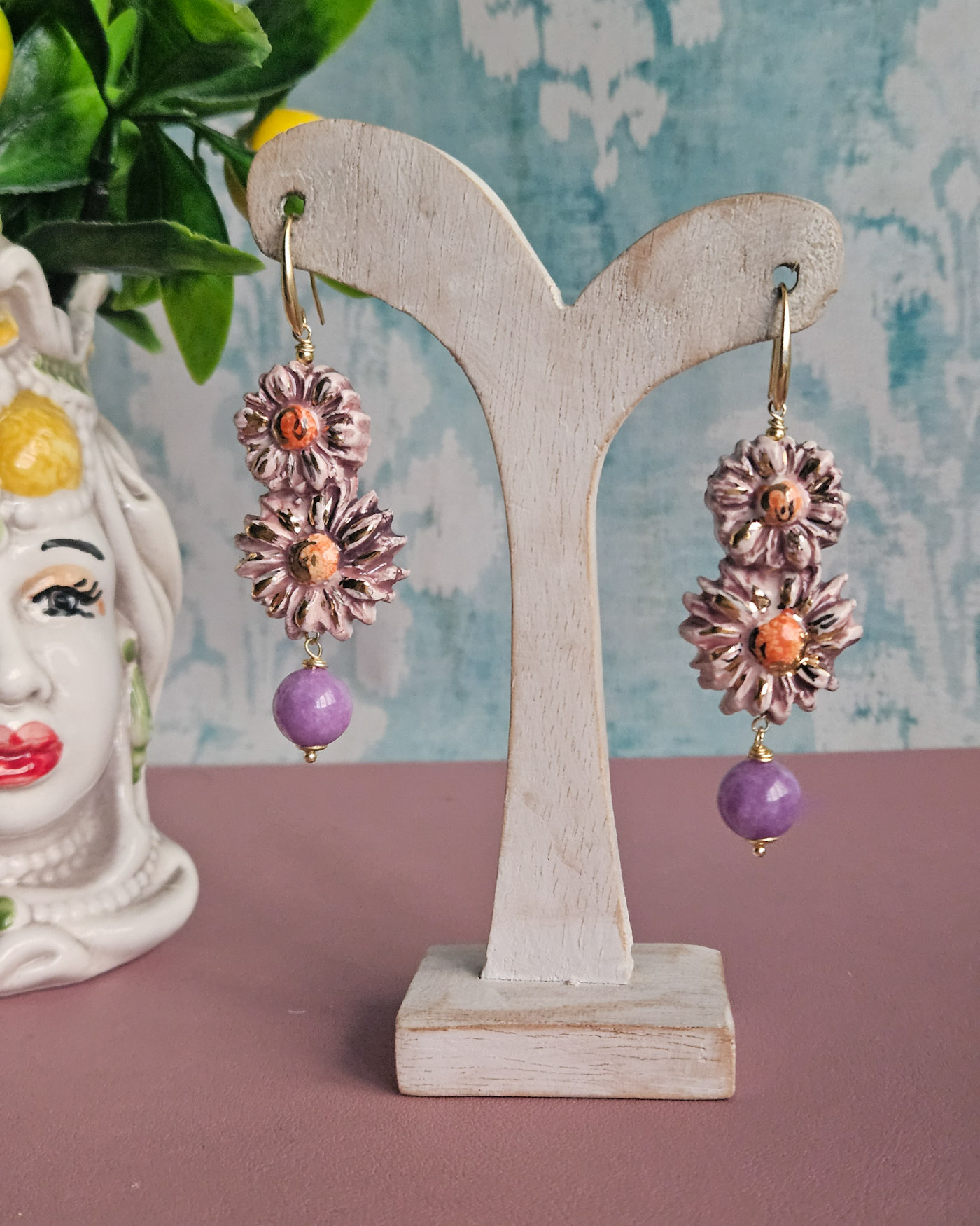Orecchini Siciliani con Doppio Fiore in Ceramica di Caltagirone e Giada Kunzite