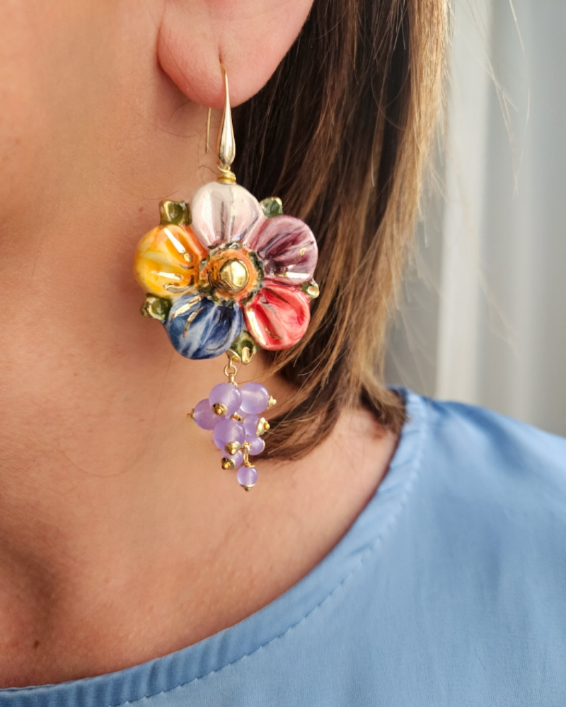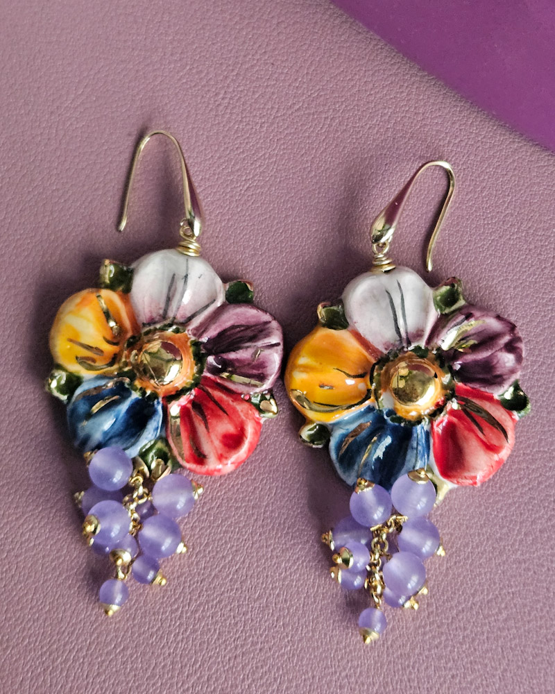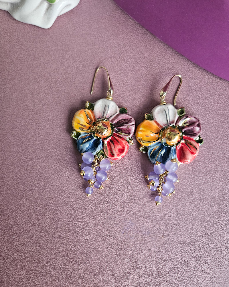 Orecchini Siciliani con Fiori in Ceramica di Caltagirone e Occhio di Gatto Lilla