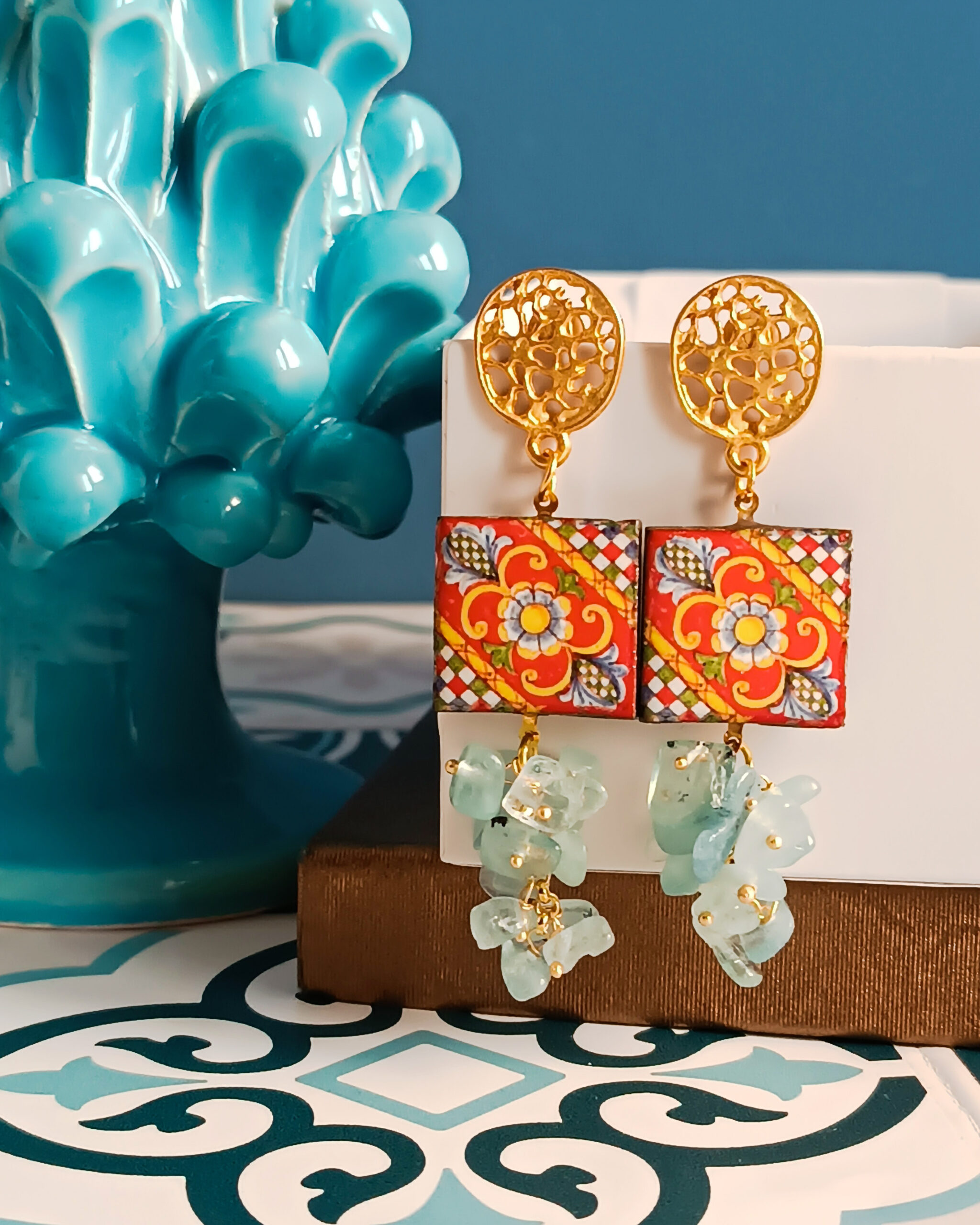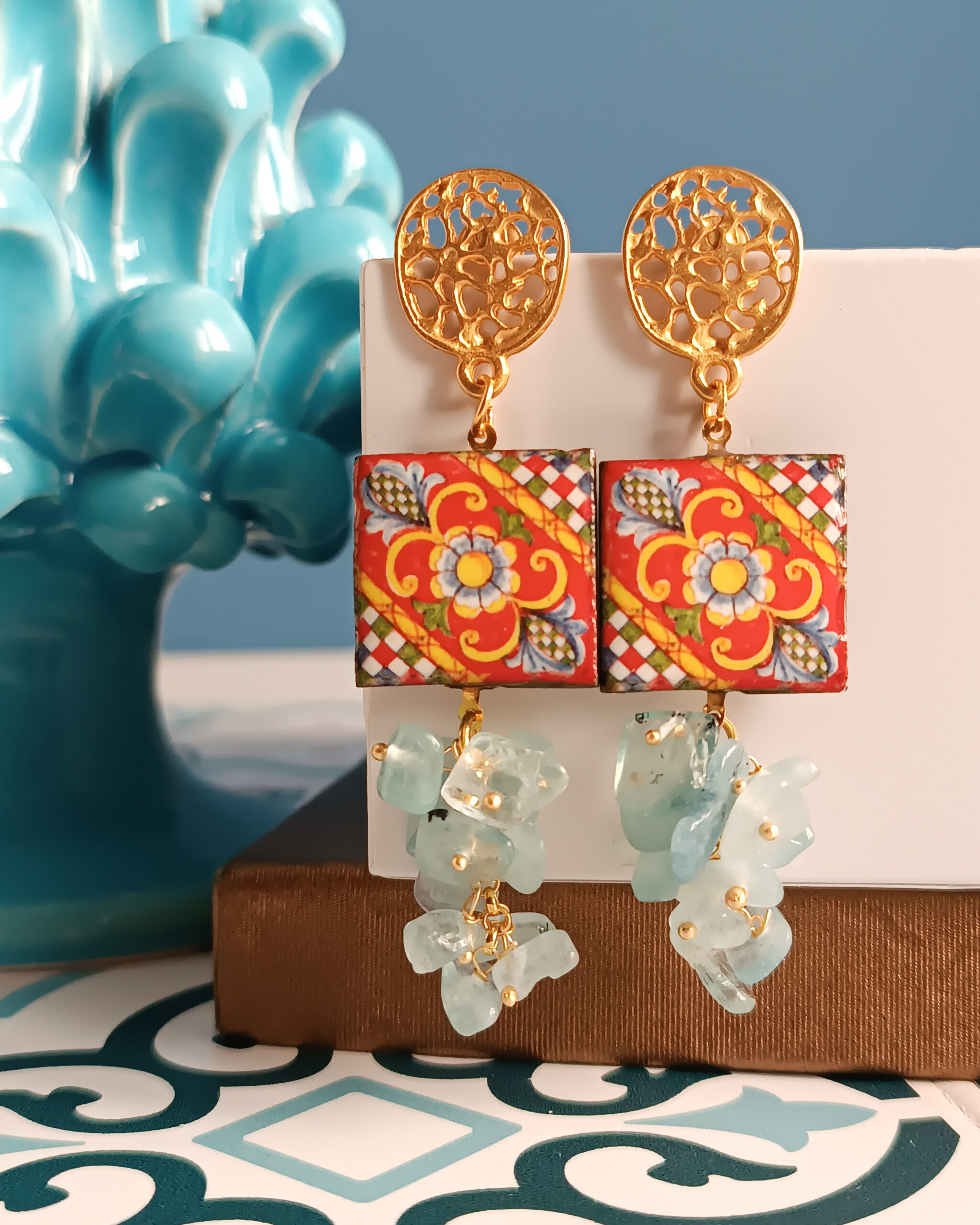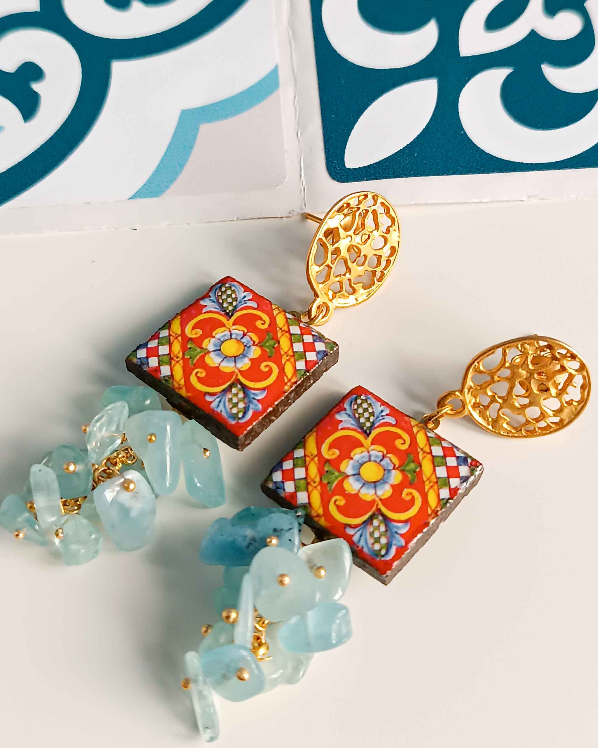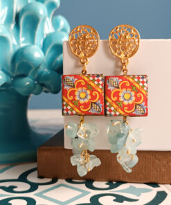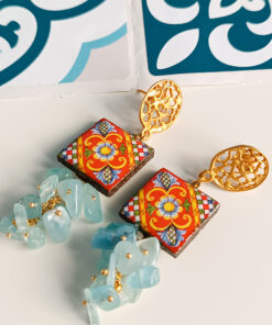 Orecchini Siciliani con Mattonelle in Ceramica di Caltagirone e Acquamarina