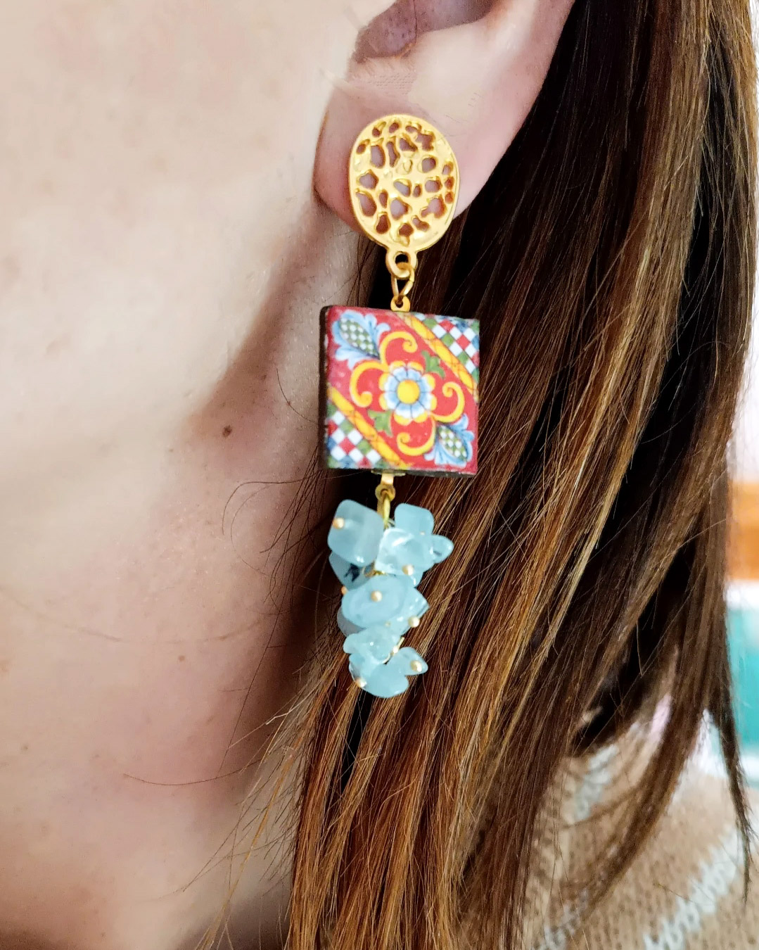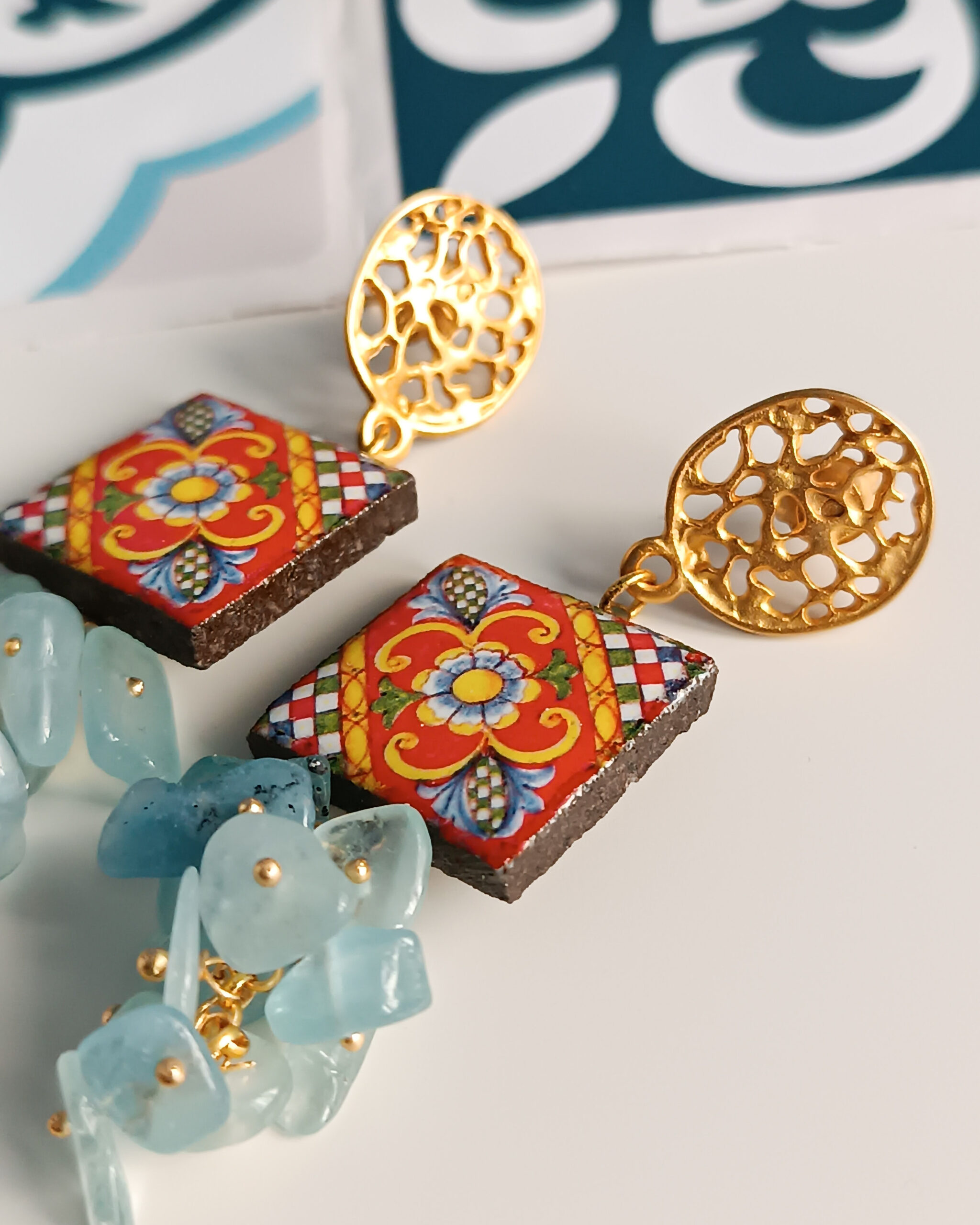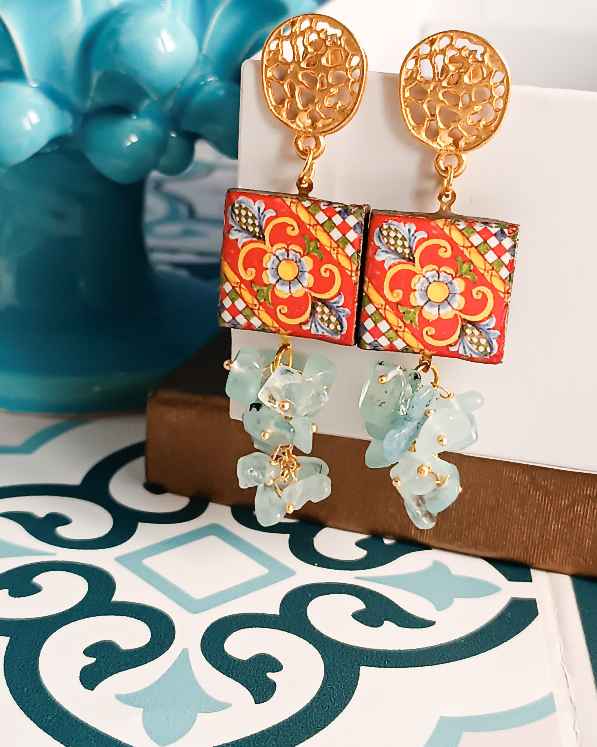 Orecchini Siciliani con Mattonelle in Ceramica di Caltagirone e Acquamarina