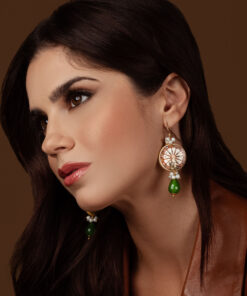 Orecchini realizzati in pieno stile siciliano: mattonelline circolari con perline di fiume e gocce di Agata verde.