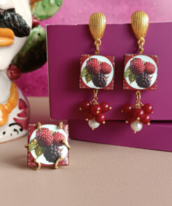 Orecchini Siciliani con Mattonelle in Ceramica di Caltagirone e Grappolo di Pietre Borgogna
