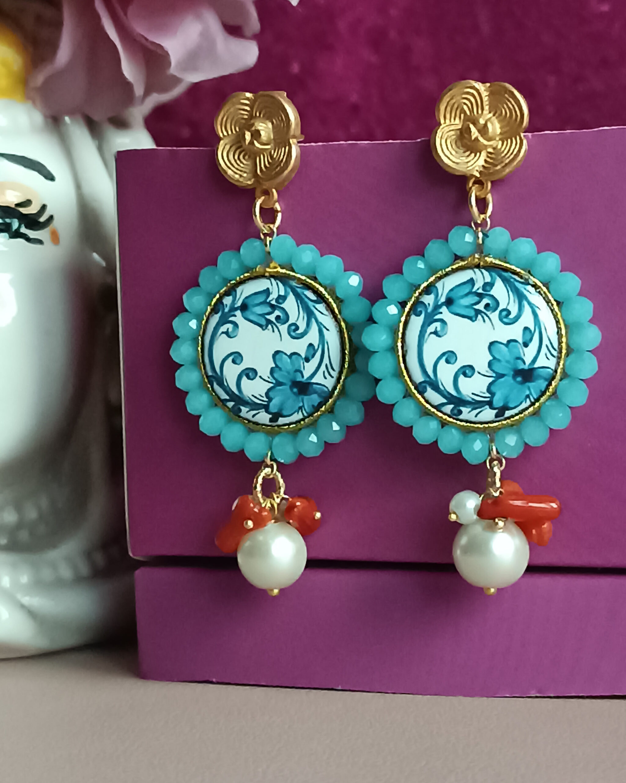 Oltre ai tipici simboli siciliani, amiamo anche proporre negli orecchini le stesse riproduzioni delle maioliche di Caltagirone che spesso si trovano come decori nelle pareti delle abitazioni siciliane.
