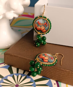 Orecchini realizzati in perfetto stile Chapeau: Mattonelline in pietra lavica e ceramica, bordate con fettuccia dorata e pietre verdi, con grappolo di pietre verdi abbinate montate su catena rolò.