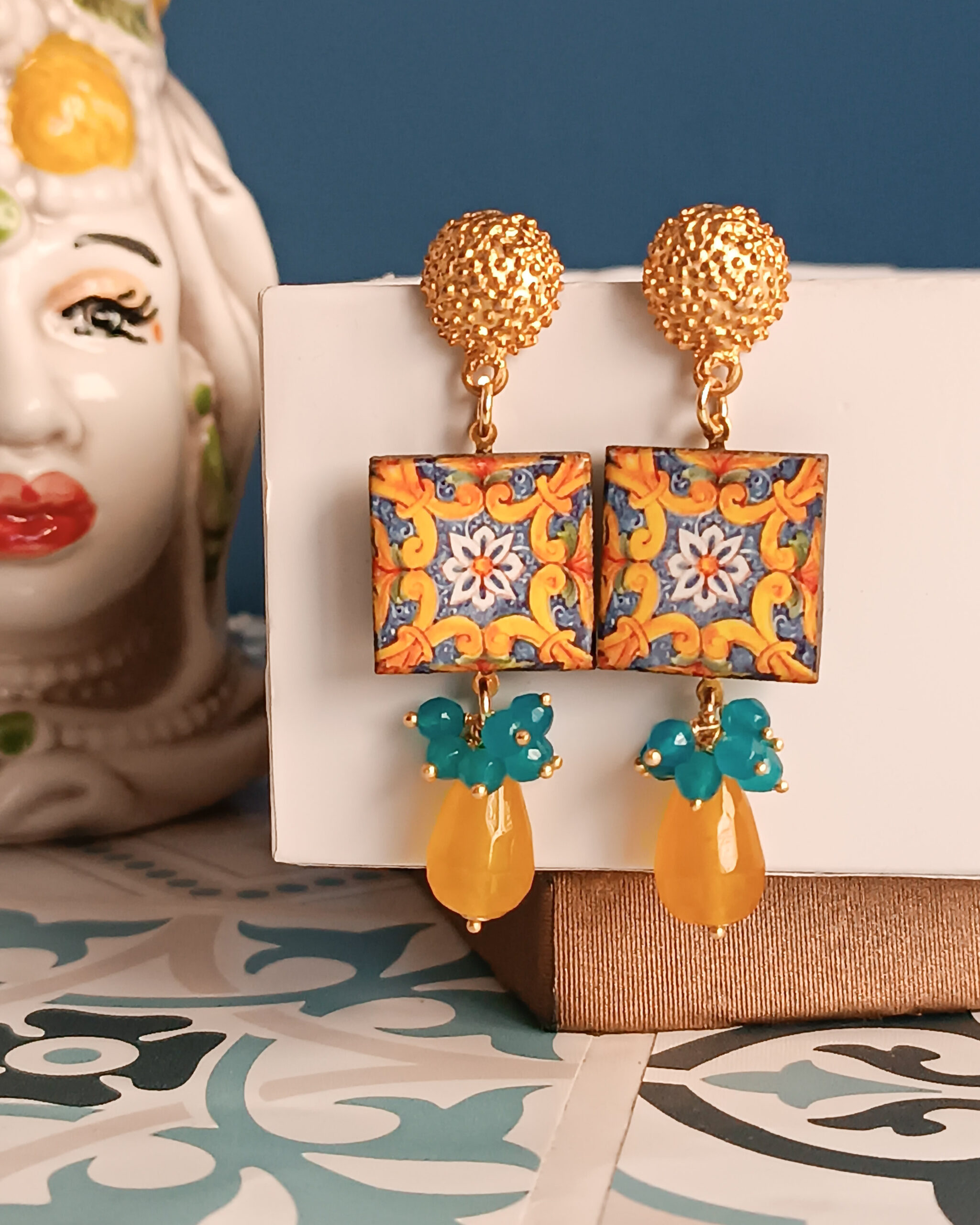 Oltre ai tipici simboli siciliani, amiamo anche proporre negli orecchini le stesse riproduzioni delle maioliche di Caltagirone che spesso si trovano come decori nelle pareti delle abitazioni siciliane.