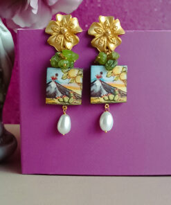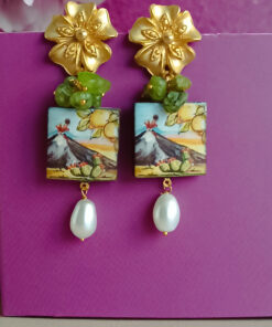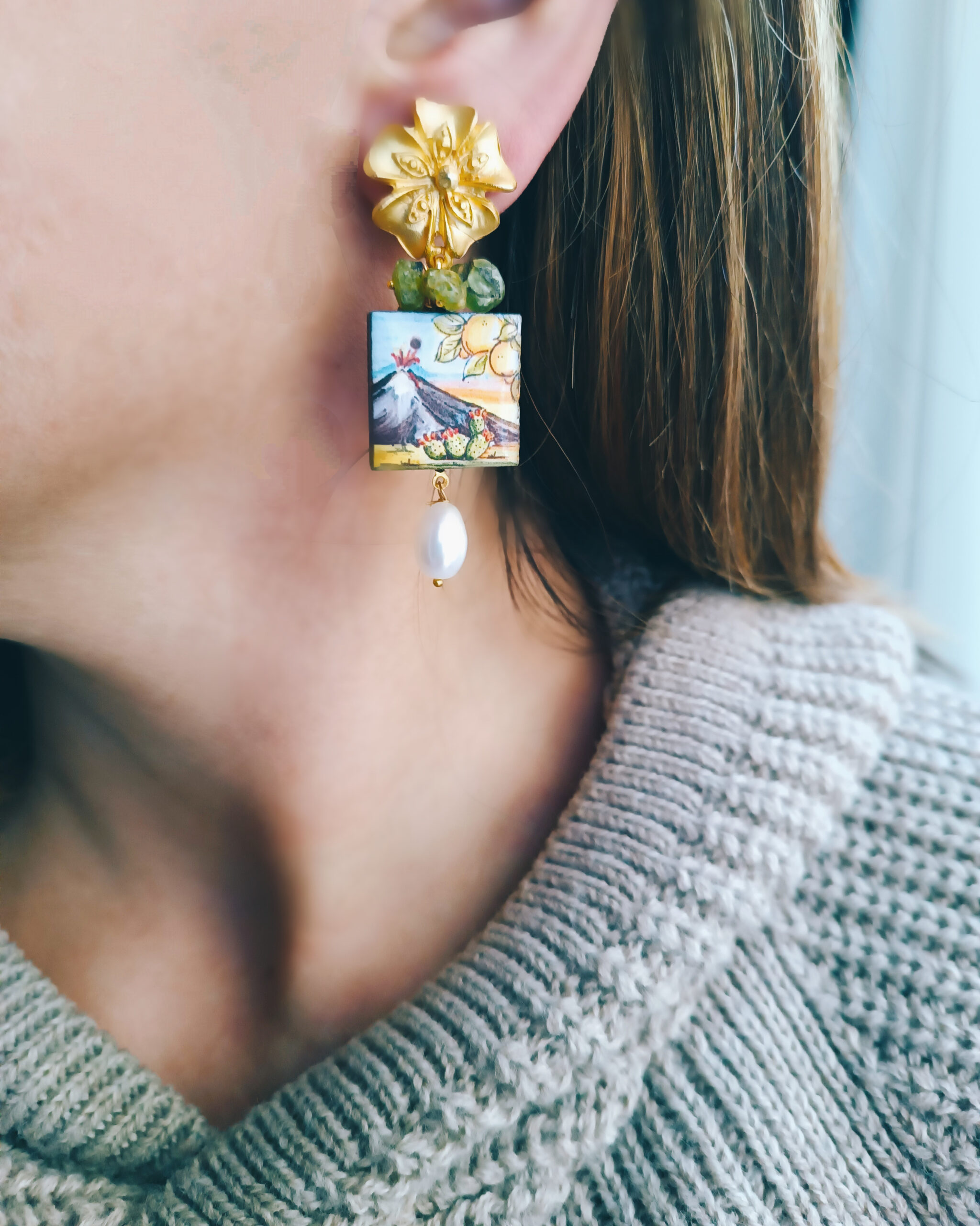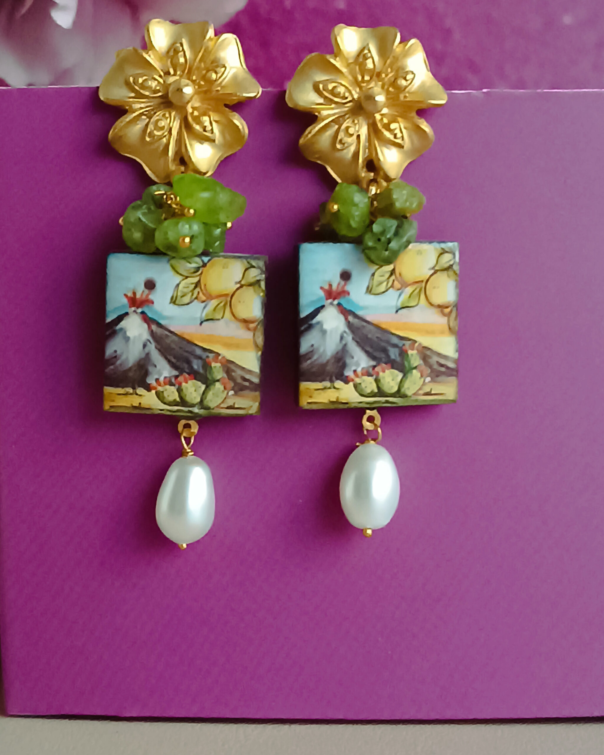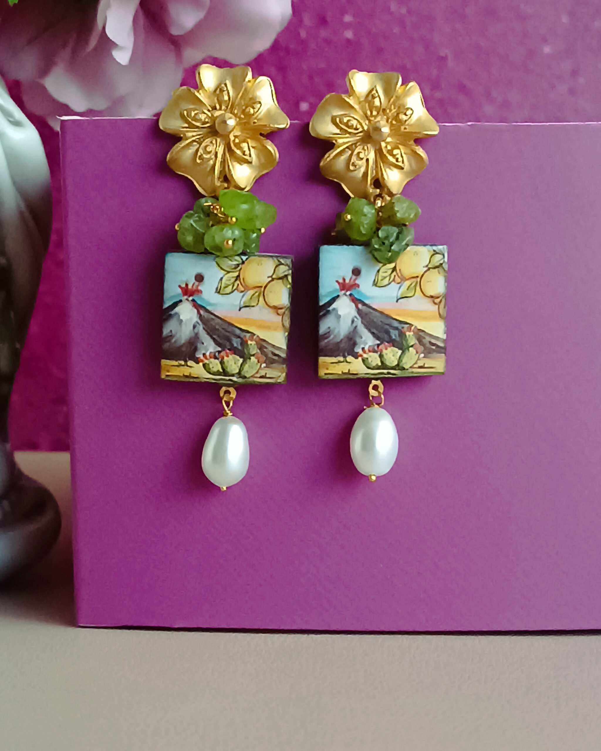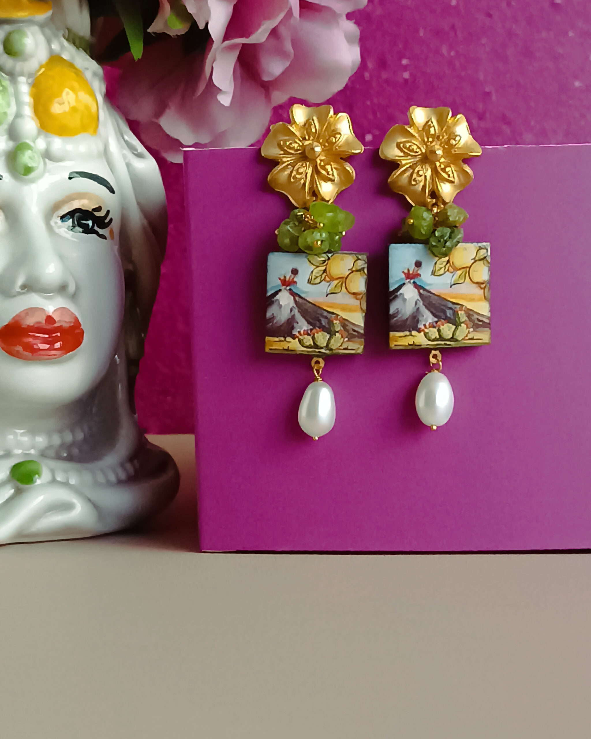 Orecchini Siciliani con Mattonelle in Ceramica di Caltagirone, Perle di Fiume e Peridoto