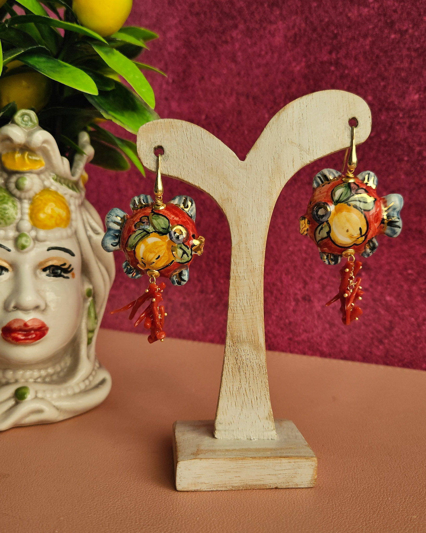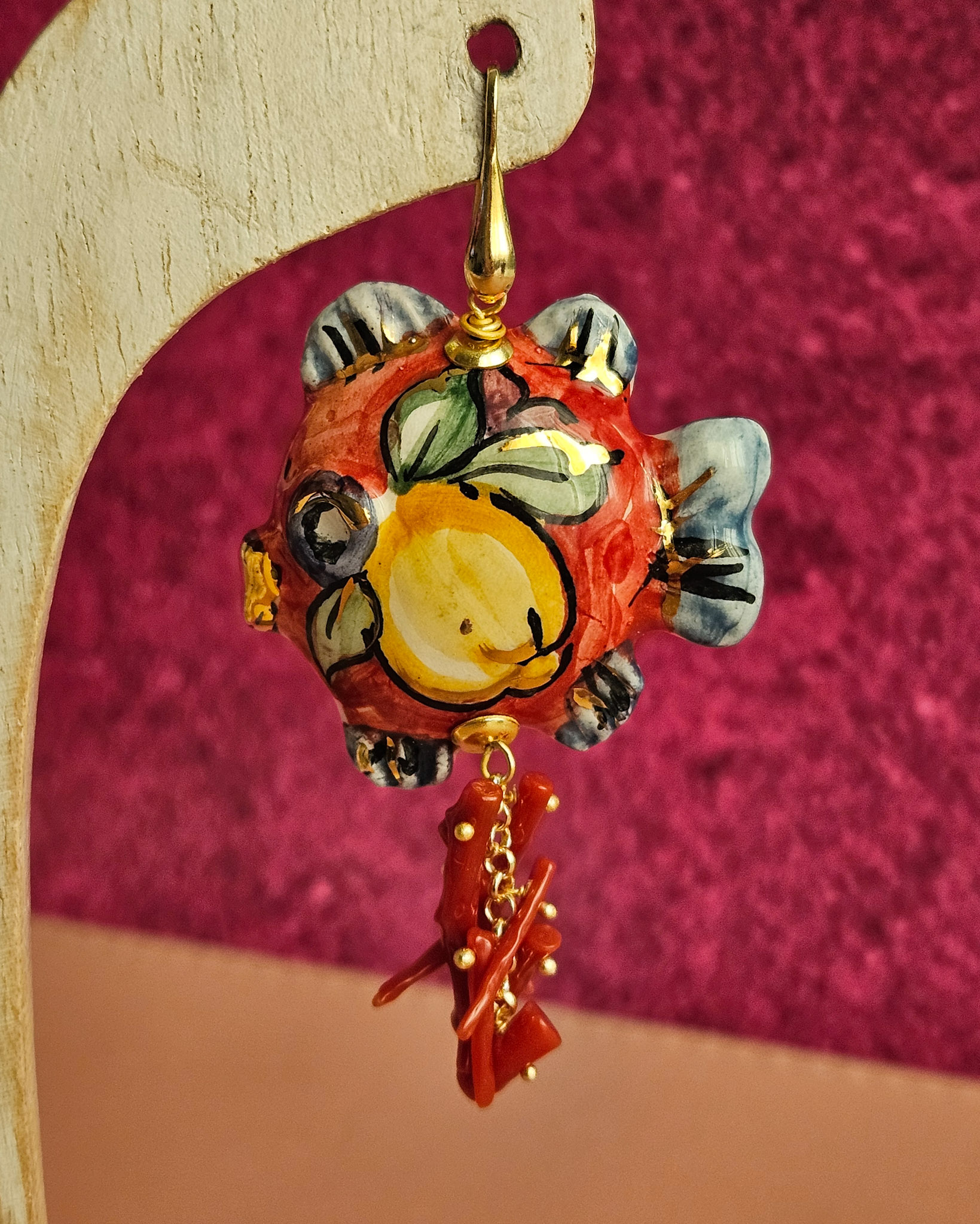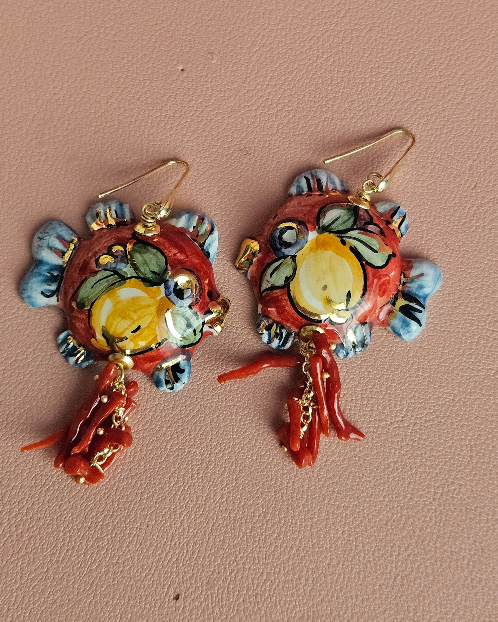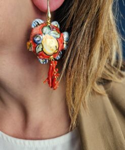 Orecchini Siciliani con Pesci in Ceramica di Caltagirone e Corallo Rosso