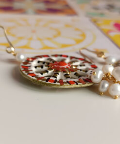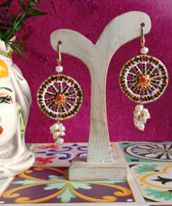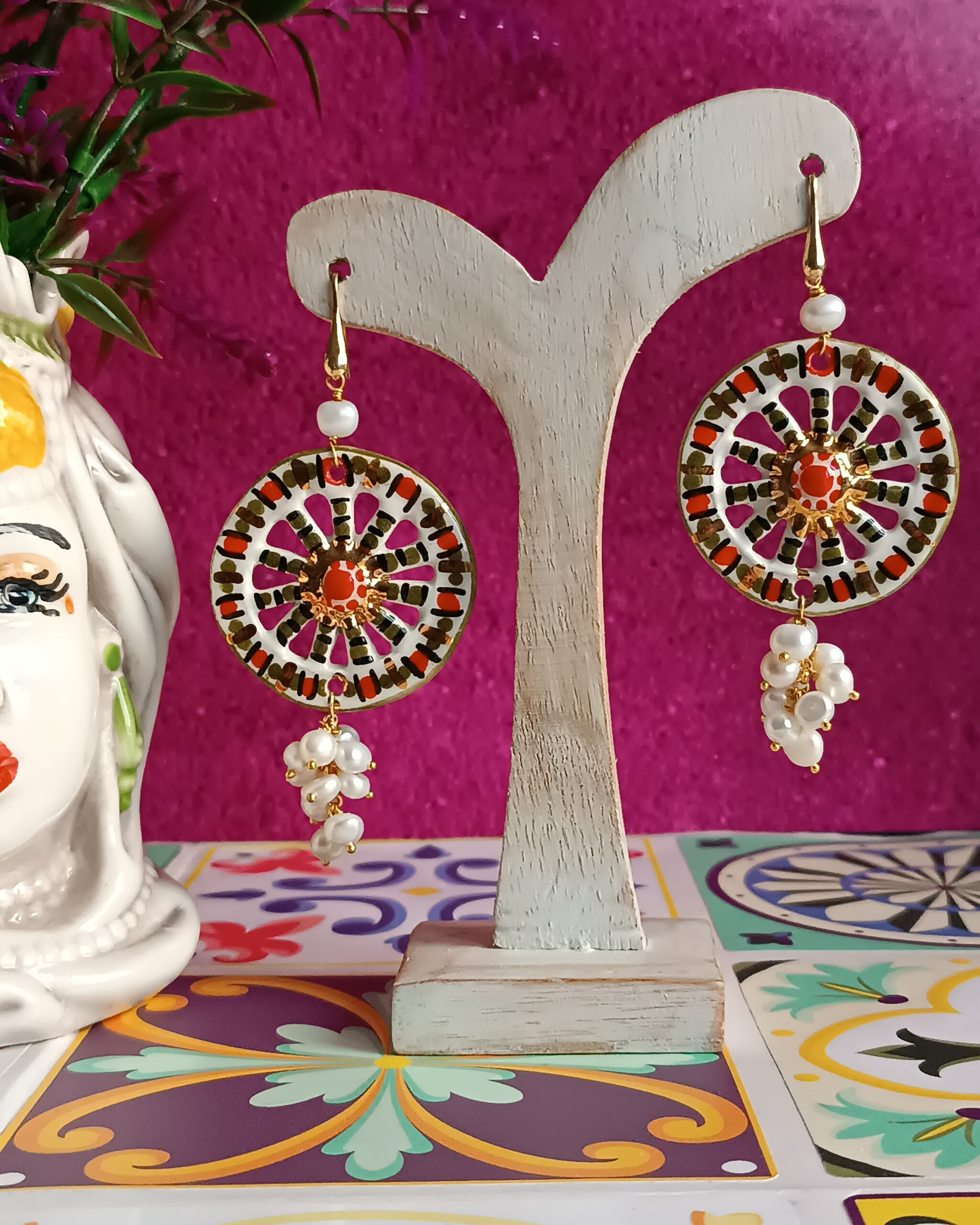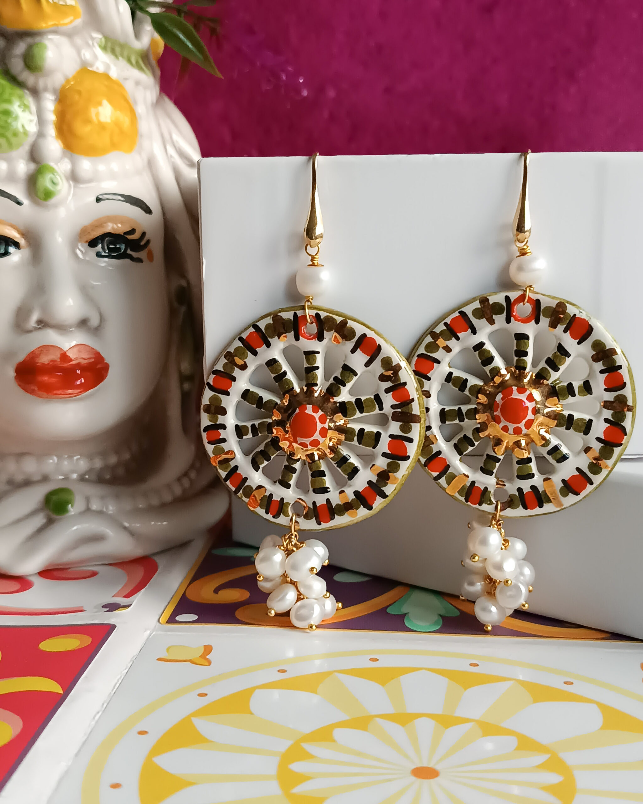 Orecchini Siciliani con Ruote del Carretto Siciliano in Ceramica di Caltagirone e Perle di Fiume