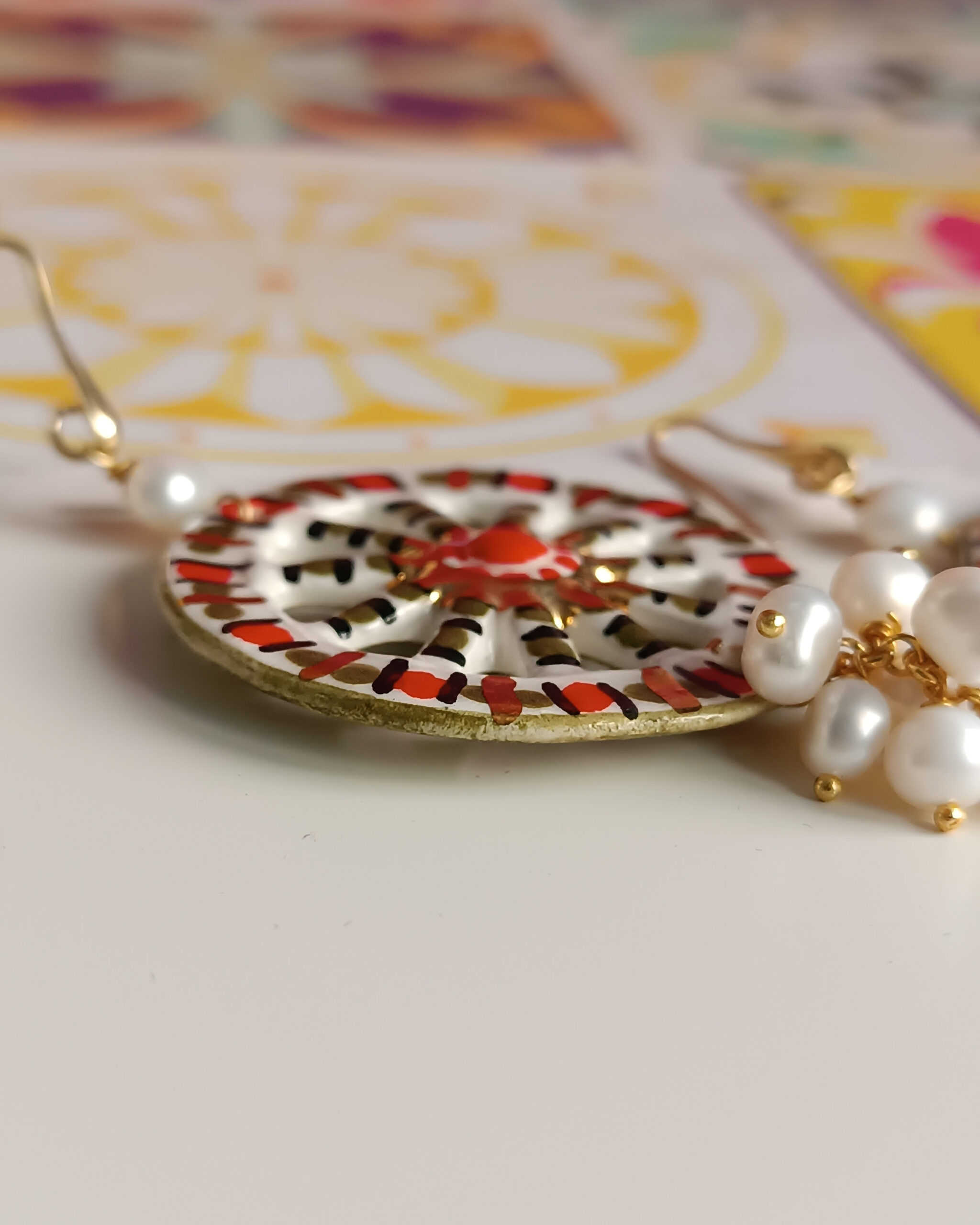 Orecchini molto luminosi ed eleganti realizzati con ruote del carretto siciliano in ceramica di Caltagirone finemente dipinta a mano con dettagli in foglia oro.