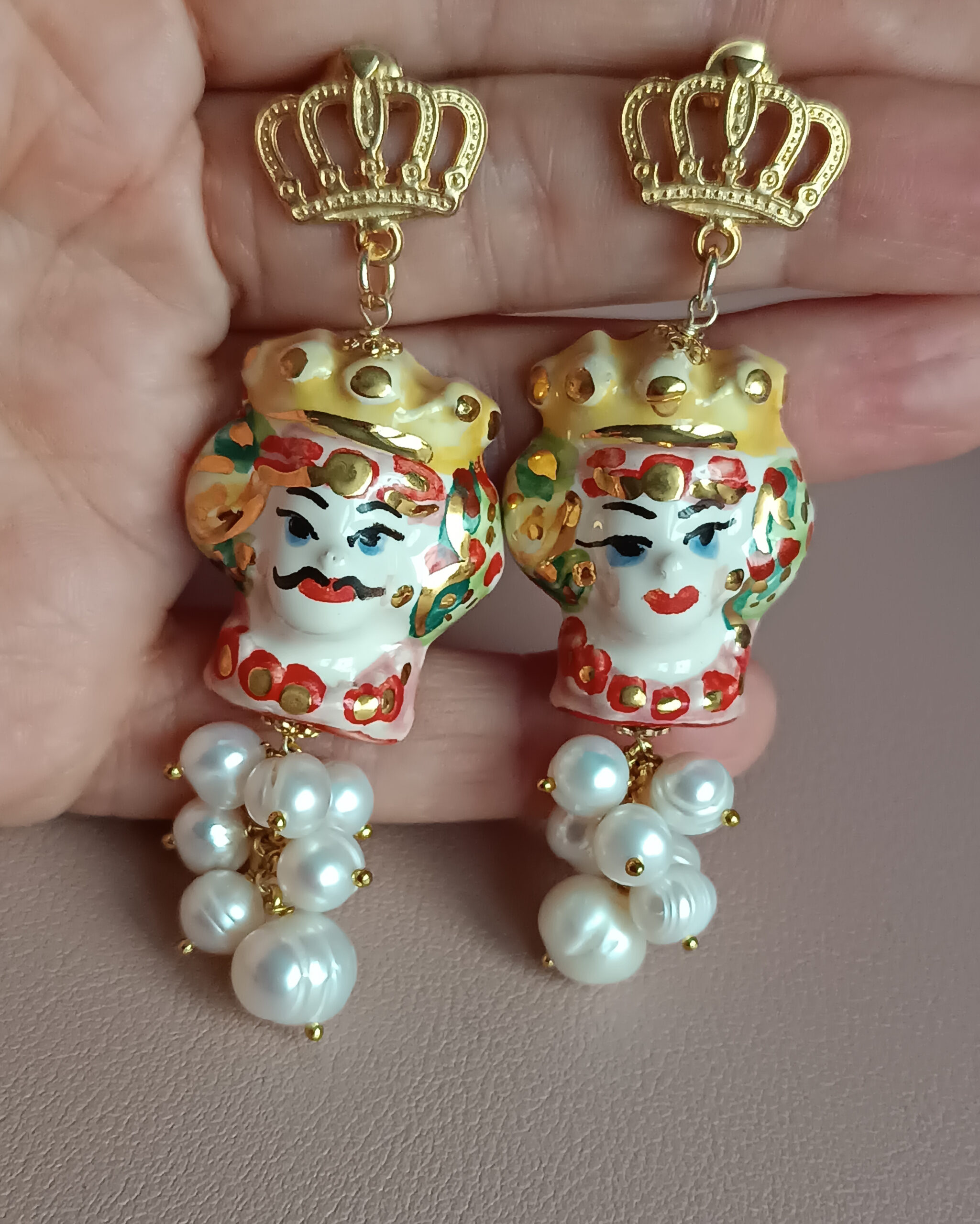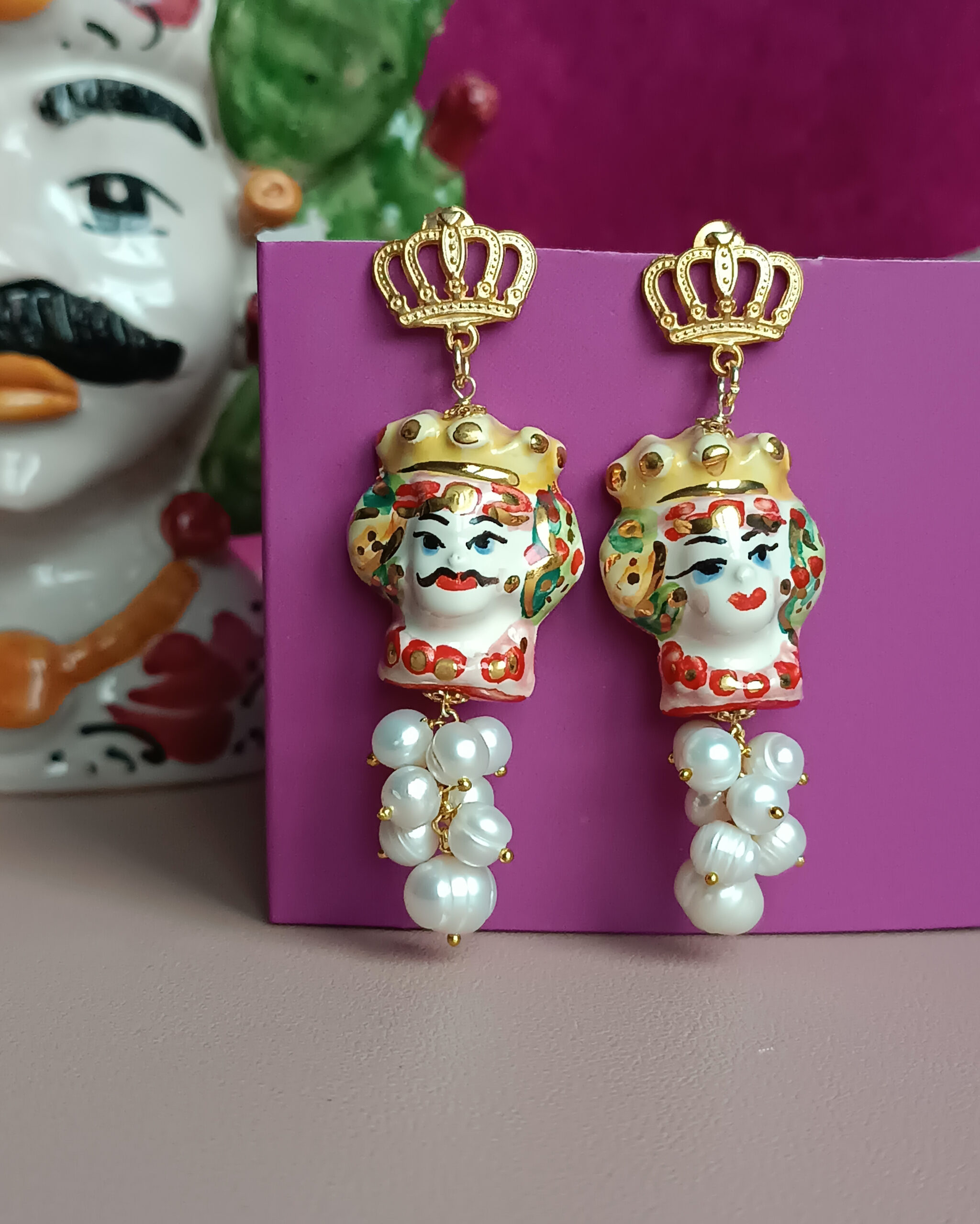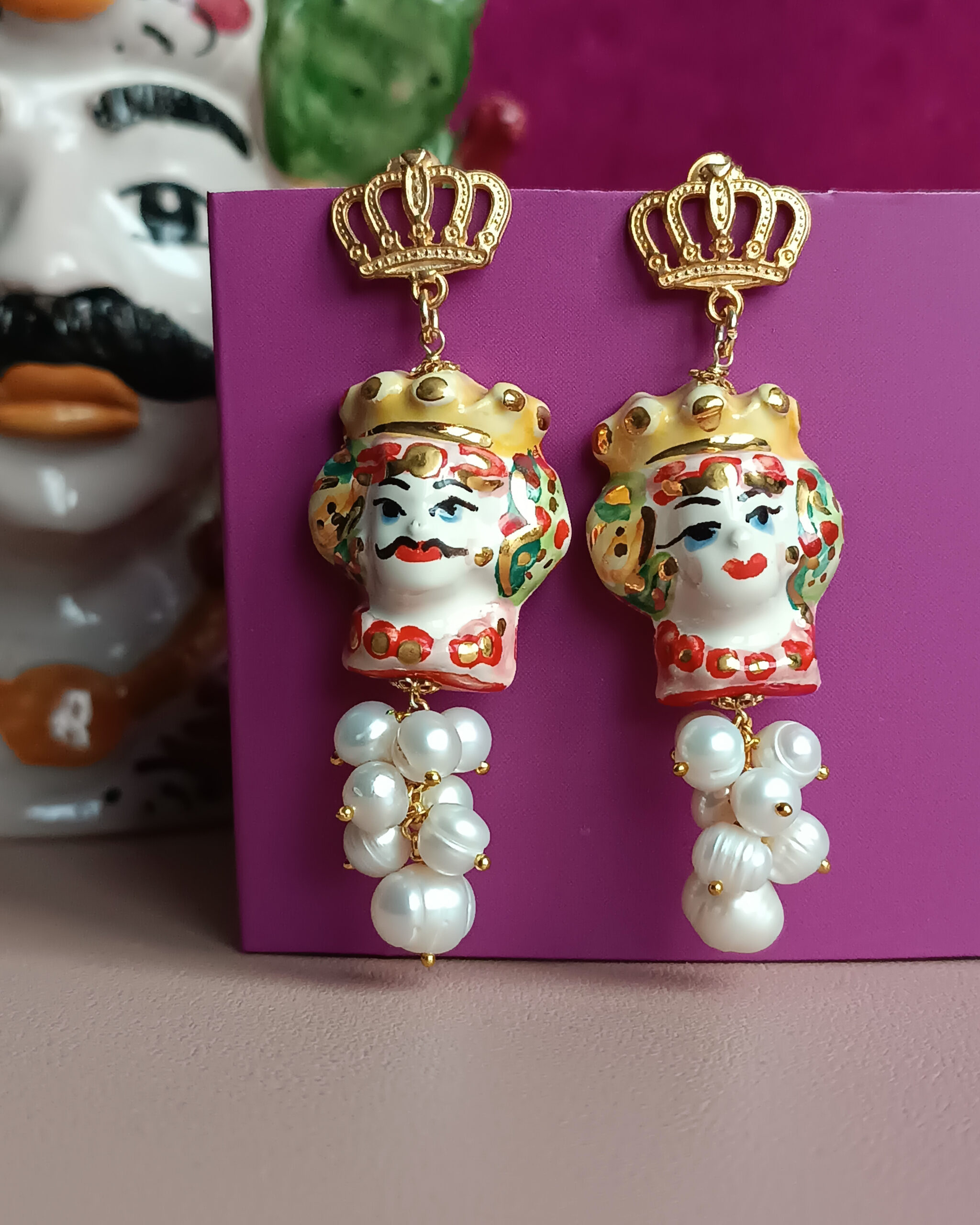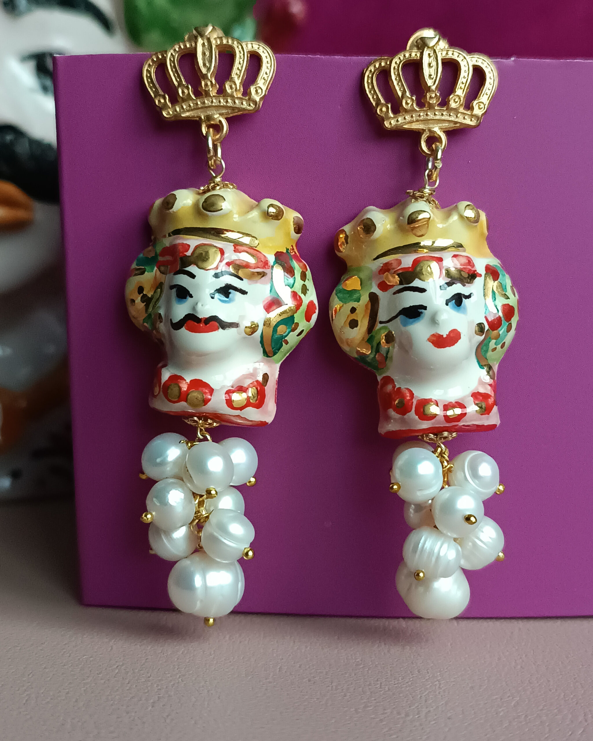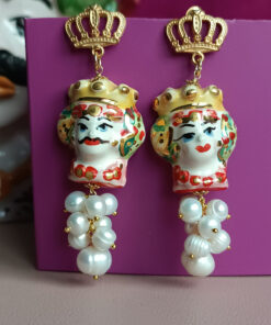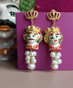 Orecchini Siciliani con Teste di Moro in Ceramica di Caltagirone Dipinta a Mano e Perle di Fiume