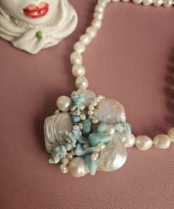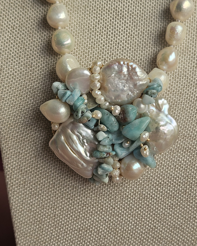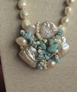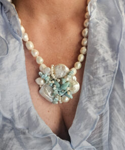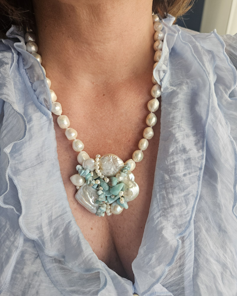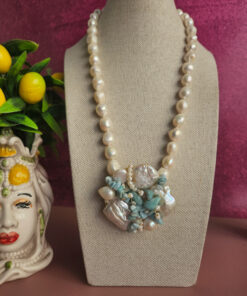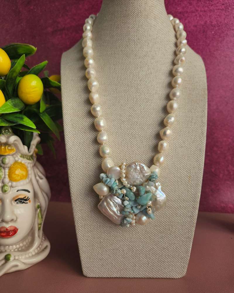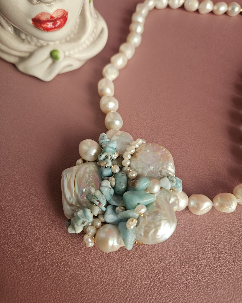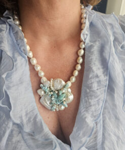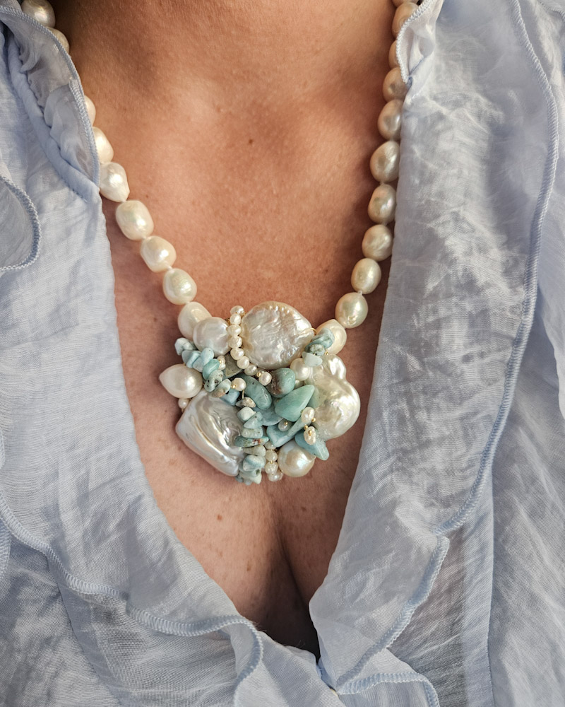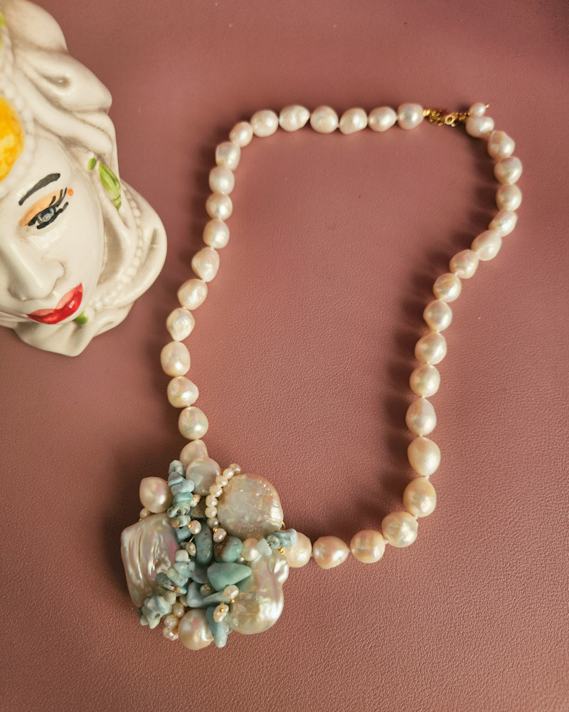Un filo elegante di perle di fiume culmina in un ricco pendente centrale formato da un’armoniosa composizione di perle, amazzonite e piccole perline, creando un effetto floreale sofisticato e moderno.