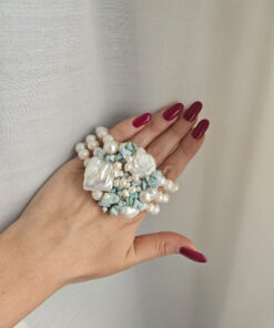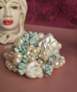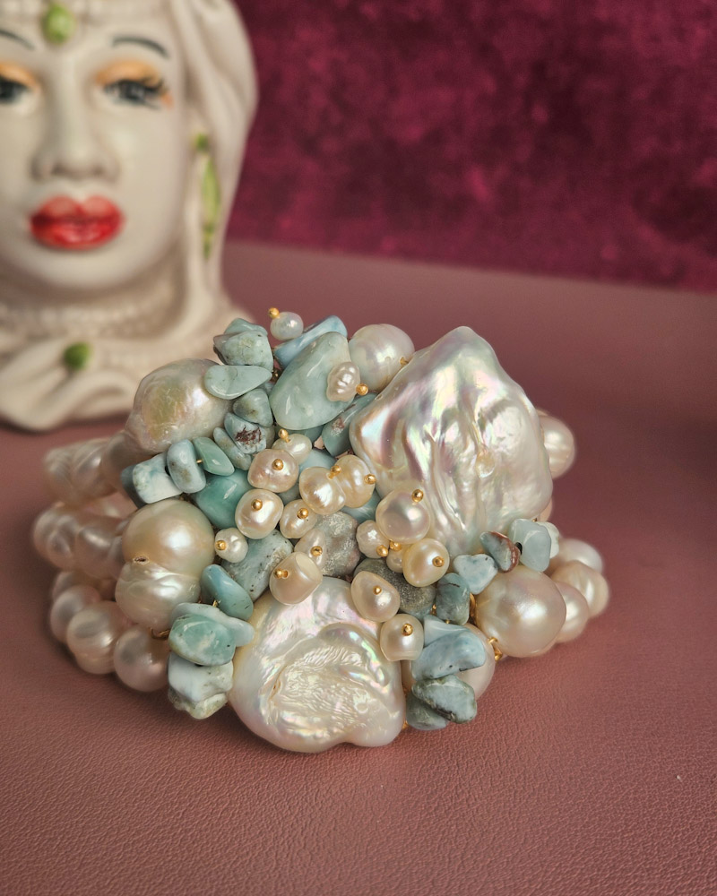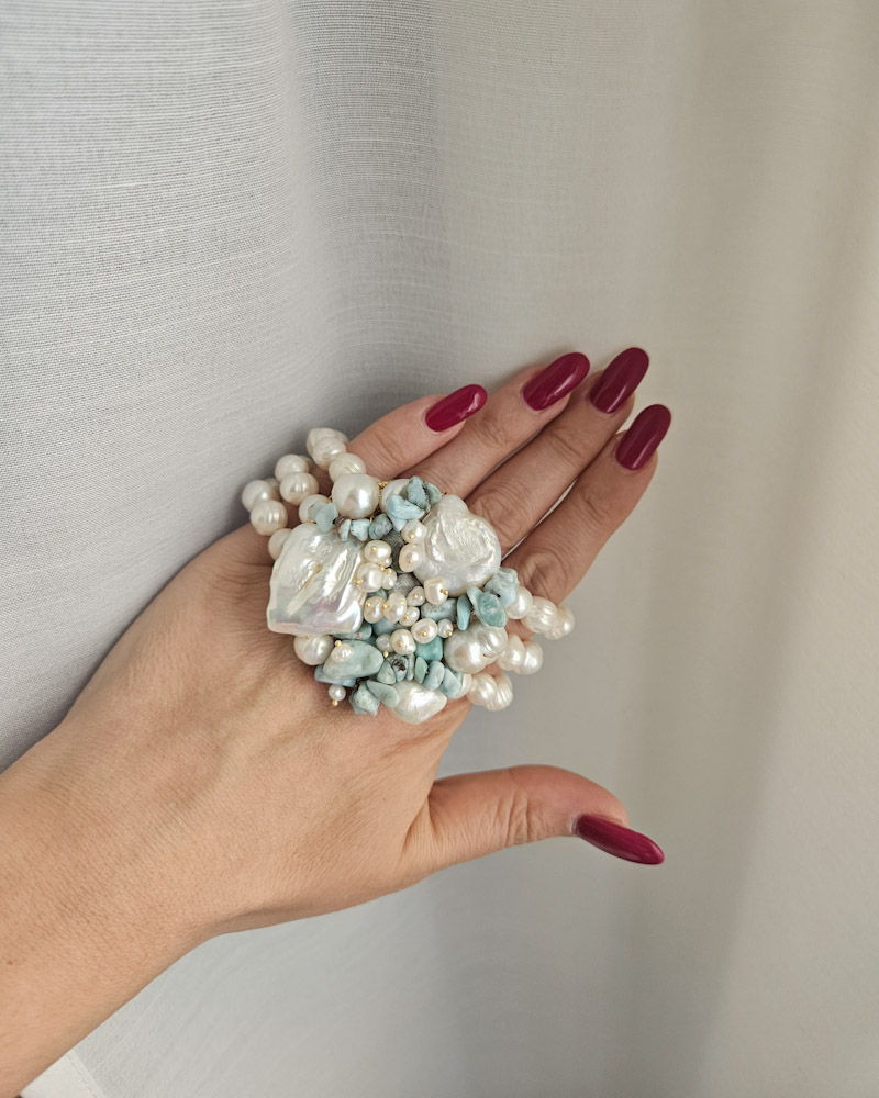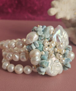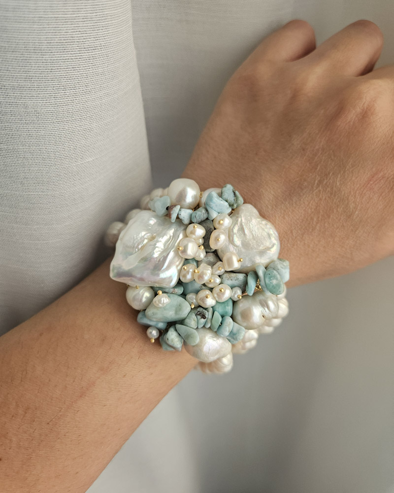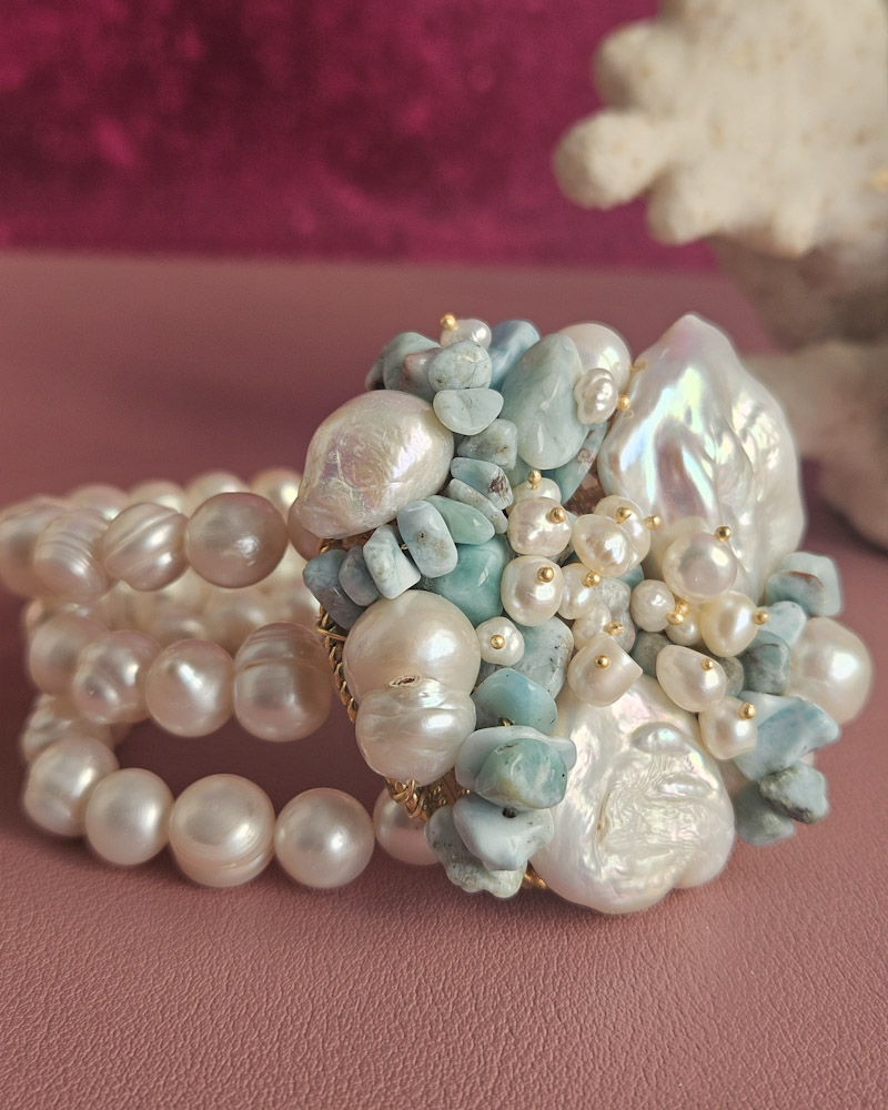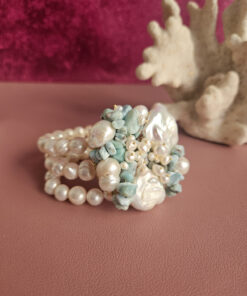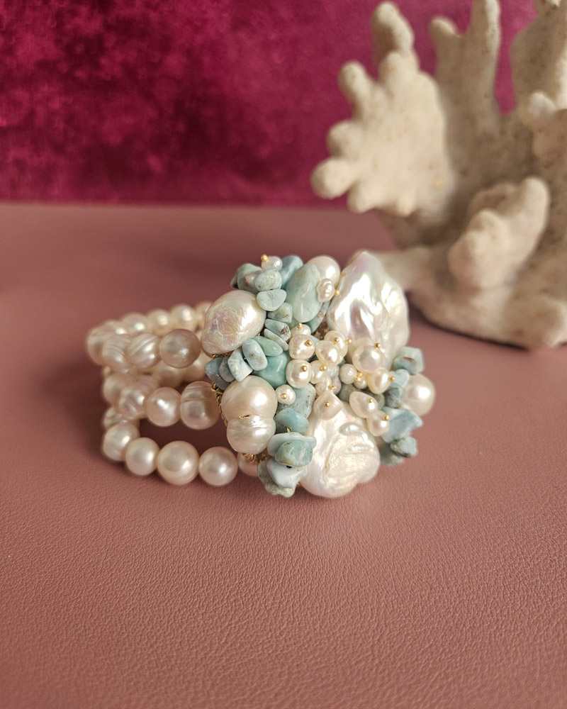 Un capolavoro di design intrecciato, dal volume importante ma delicato al polso. Le perle di fiume e i frammenti di amazzonite si fondono in un mix equilibrato e luminoso, ideale per chi ama i dettagli unici e la bellezza.