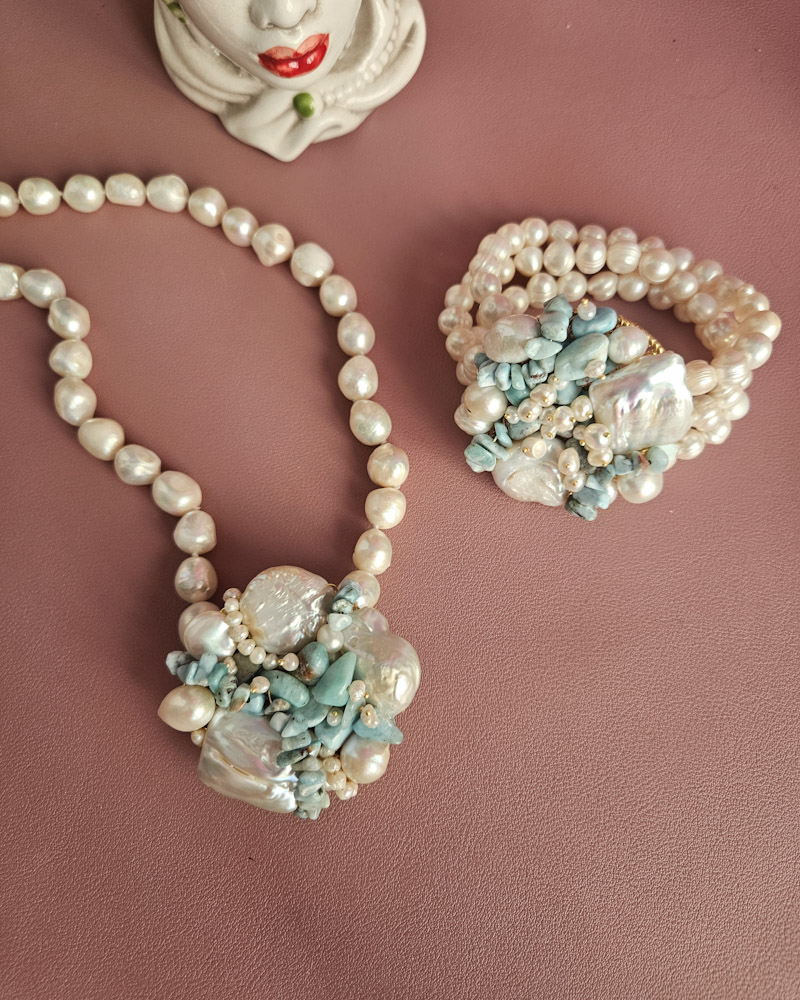 Raffinata parure composta da collana e bracciale multifilo, realizzati interamente a mano con perle di fiume irregolari e amazzonite naturale, una pietra dalle delicate sfumature acquamarina che richiama i colori del mare.