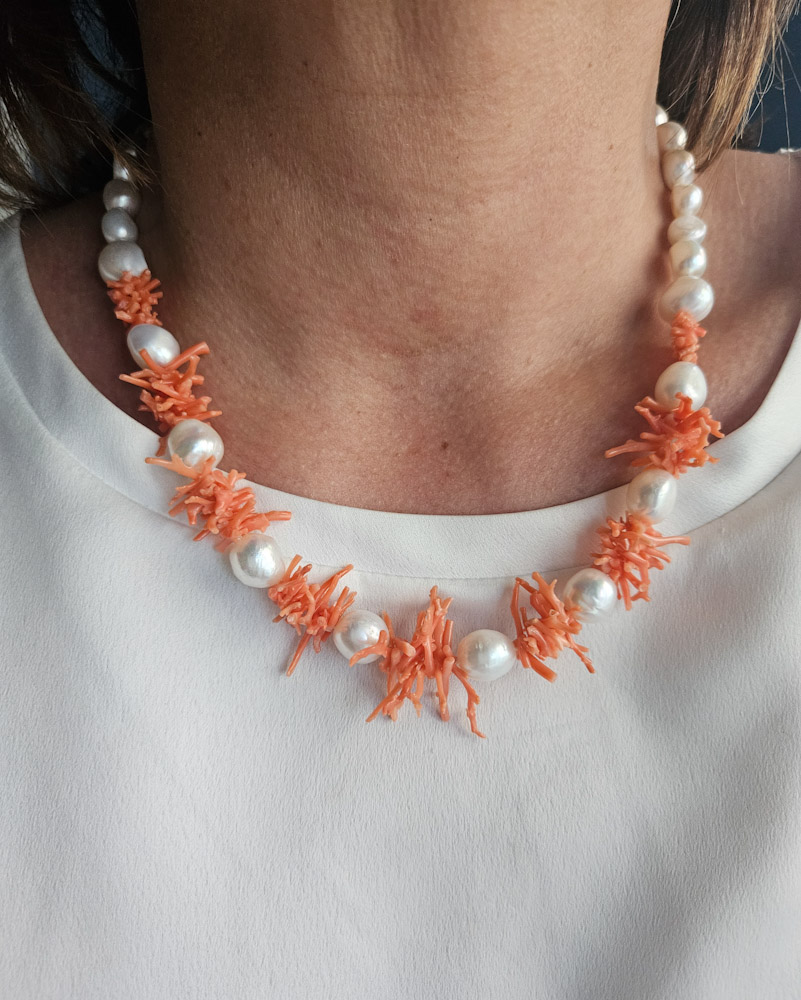 Questa parure realizzata con perle luminose e rametti di corallo, rappresenta una scelta sofisticata e originale per chi ama i gioielli dal carattere distintivo.