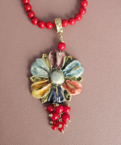 I fiori in ceramica, modellati e dipinti a mano, donano un tocco distintivo e raffinato, mentre l’agata rossa aggiunge calore e colore. Un abbinamento che unisce tradizione siciliana e stile contemporaneo, ideale per chi cerca un accessorio originale che sarà oggetto di sicura ammirazione.