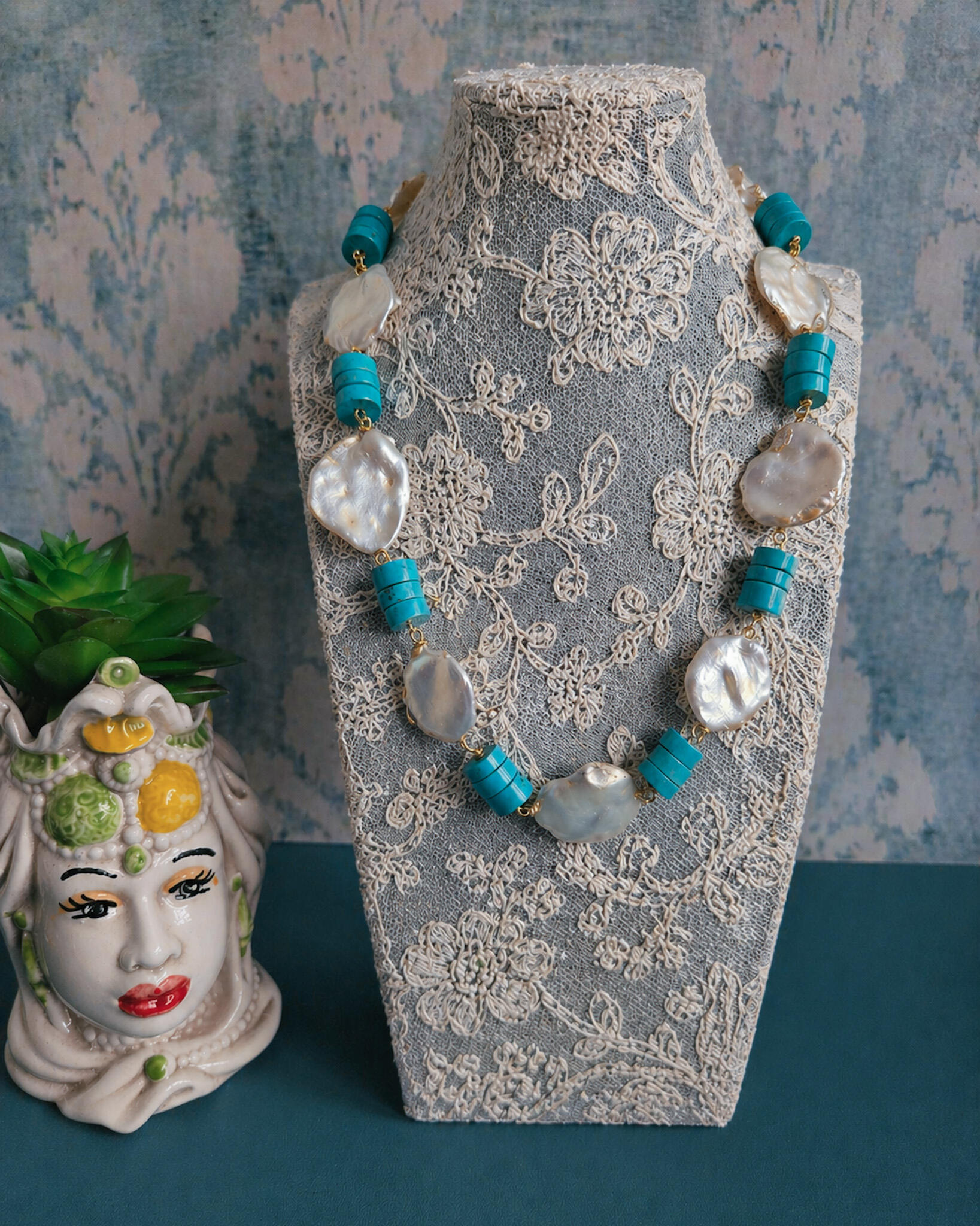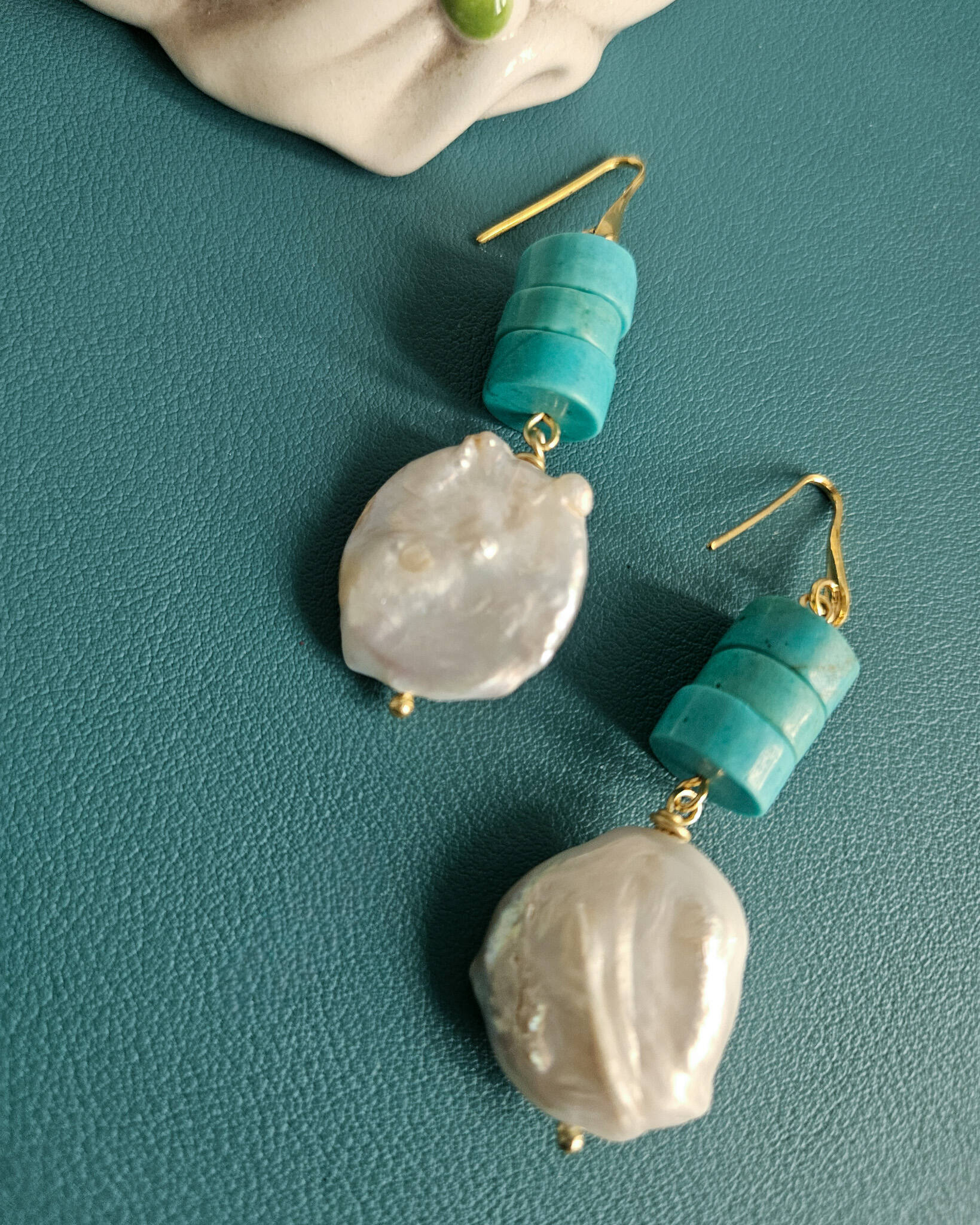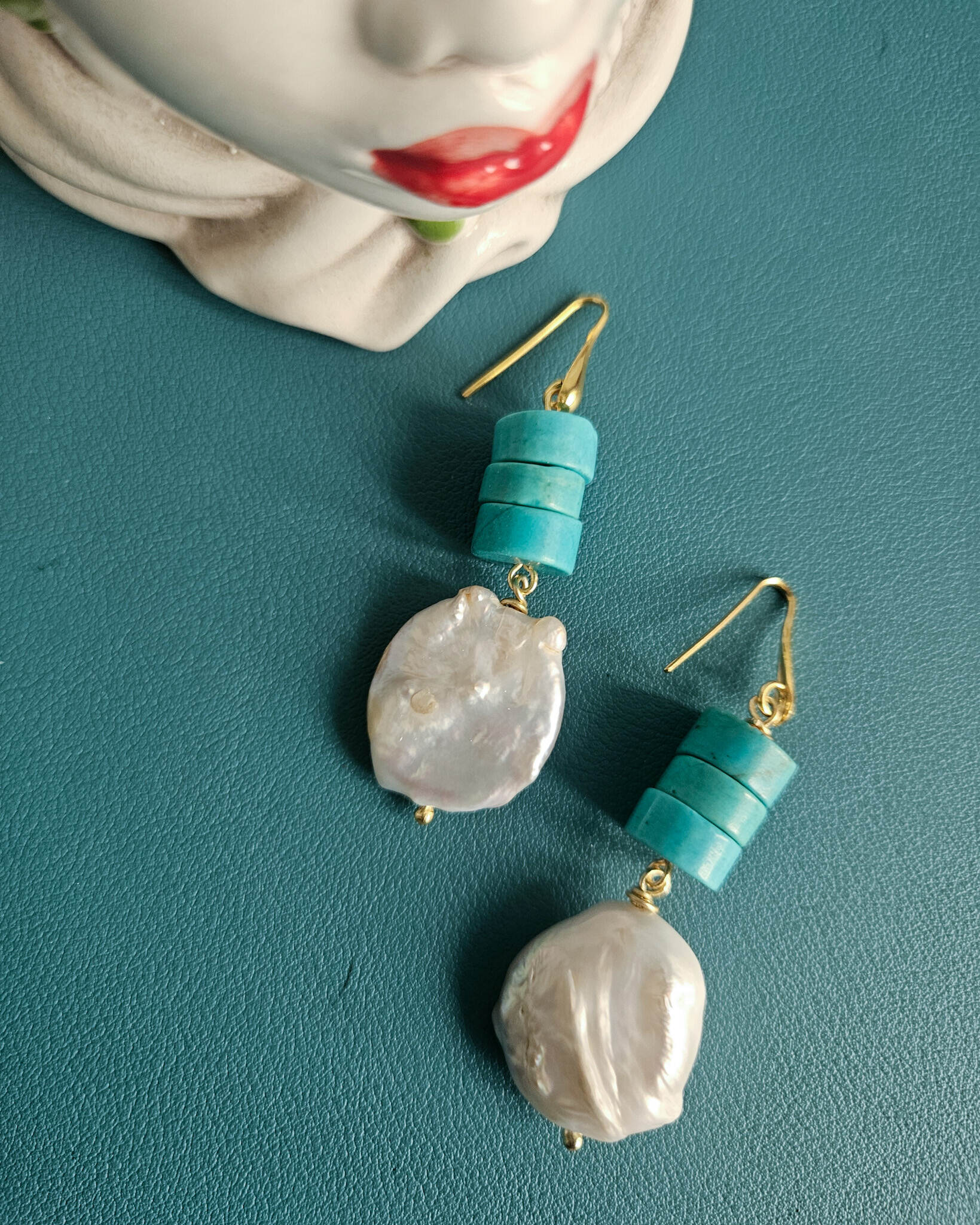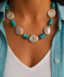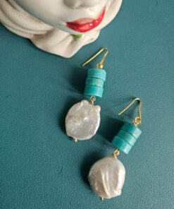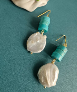 Una parure che gioca sui contrasti: la matericità irregolare delle perle barocche incontra il colore pieno e deciso della pasta di turchese. Il risultato è un insieme luminoso, ma con carattere, che valorizza subito il viso e il décolleté.